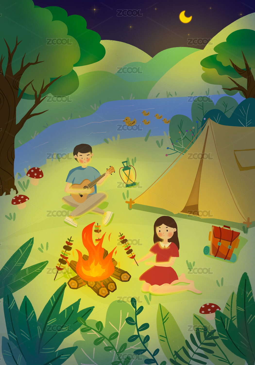 夏天在森林公园郊游野炊帐篷外弹吉他的男孩