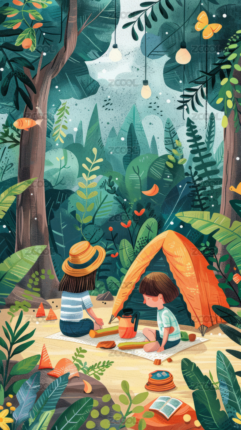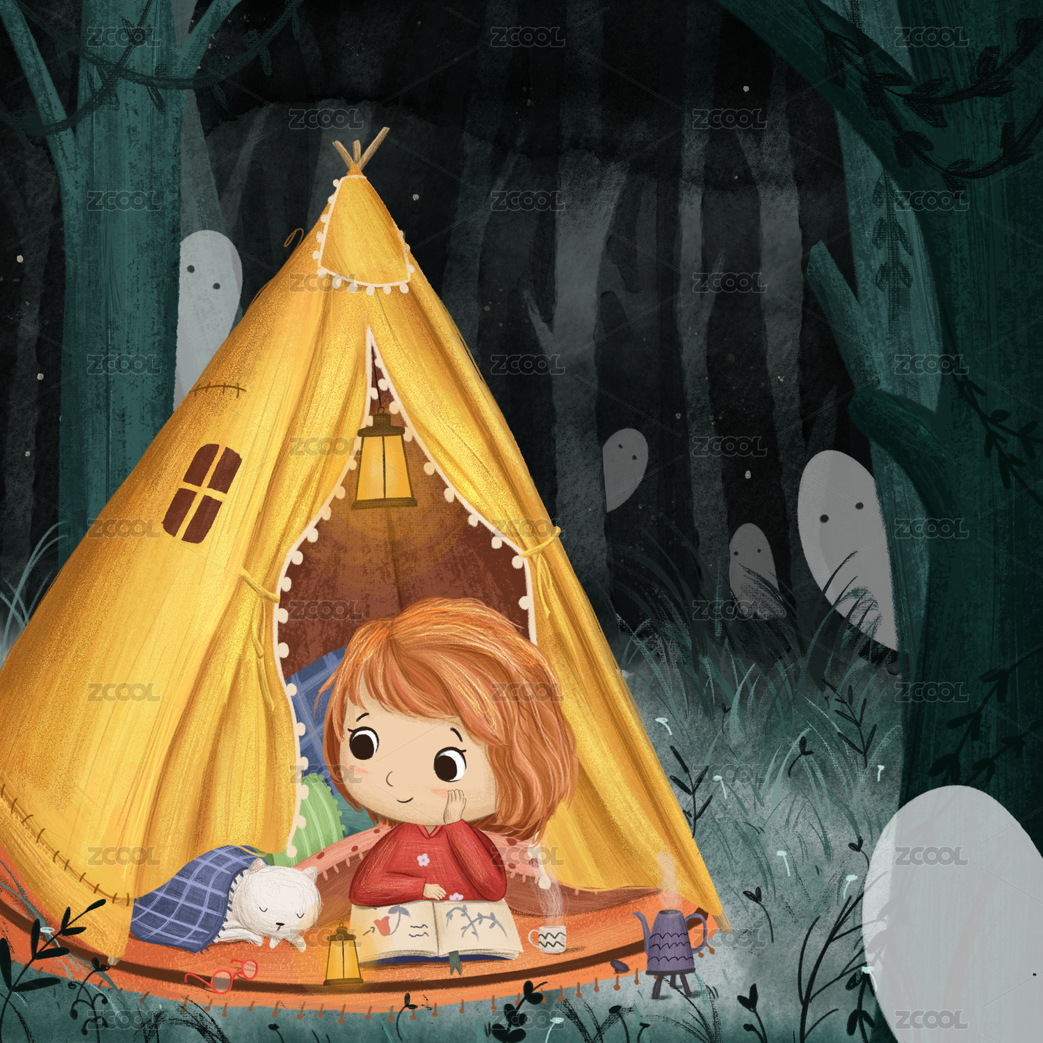 野餐女孩草地露营帐篷森林春游春天春季儿童