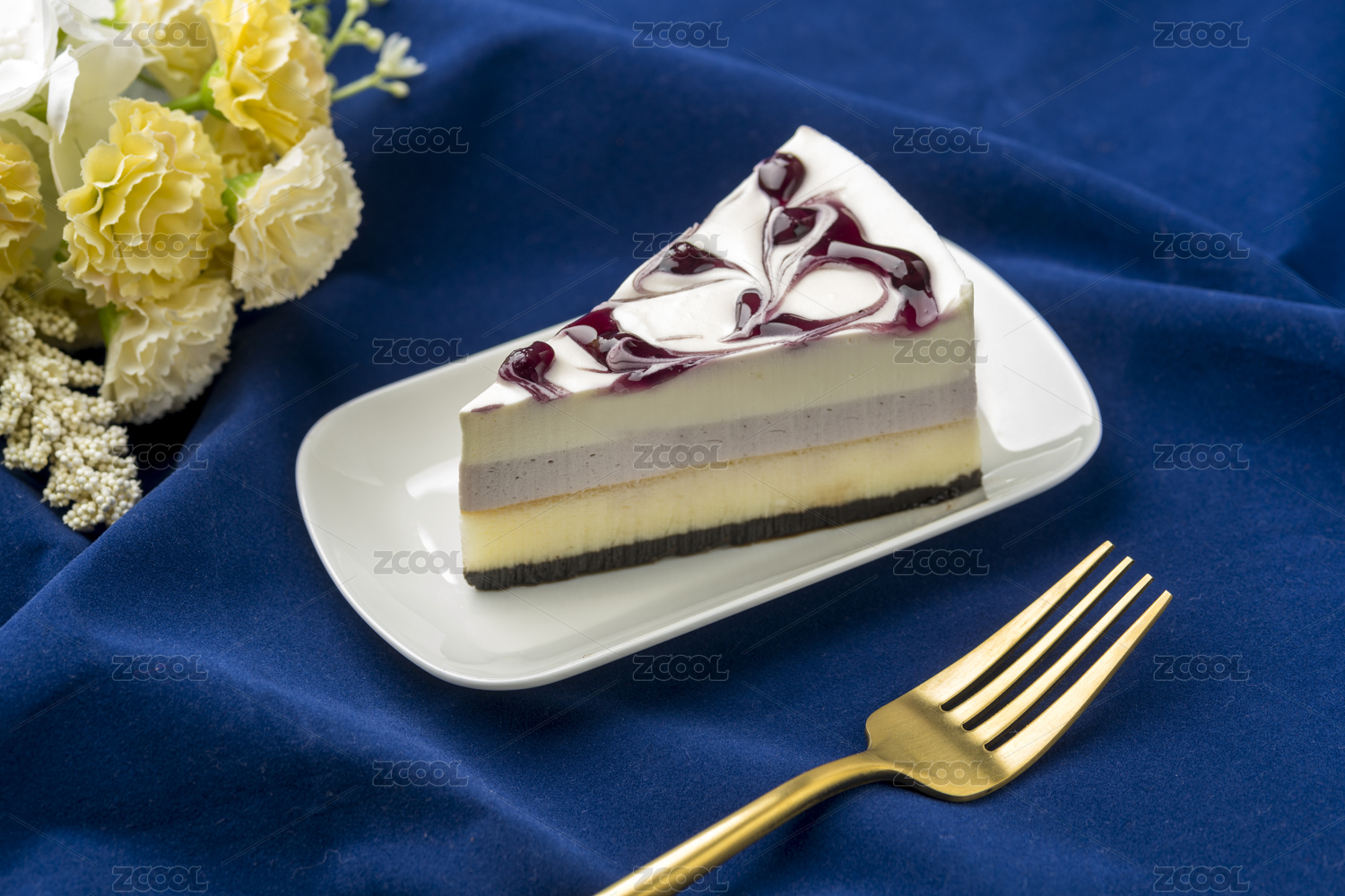 白色桌面上放着一角蓝莓酱多层夹心蛋糕