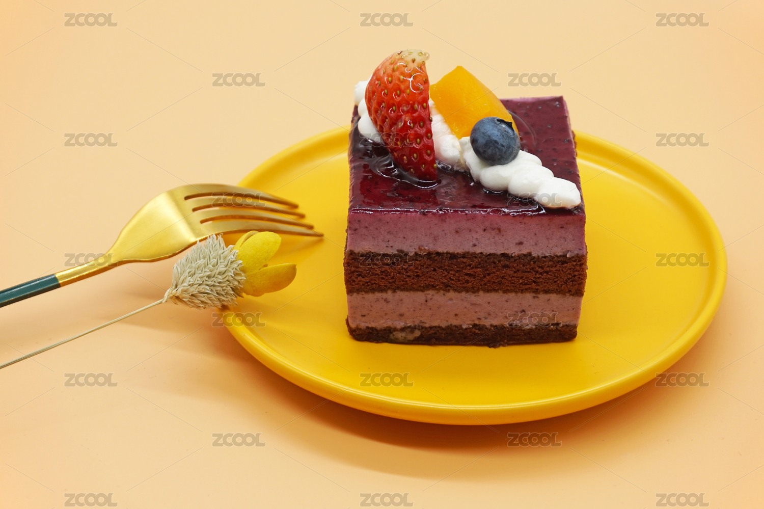 美味的下午茶蓝莓蛋糕放在黄色的碟子中