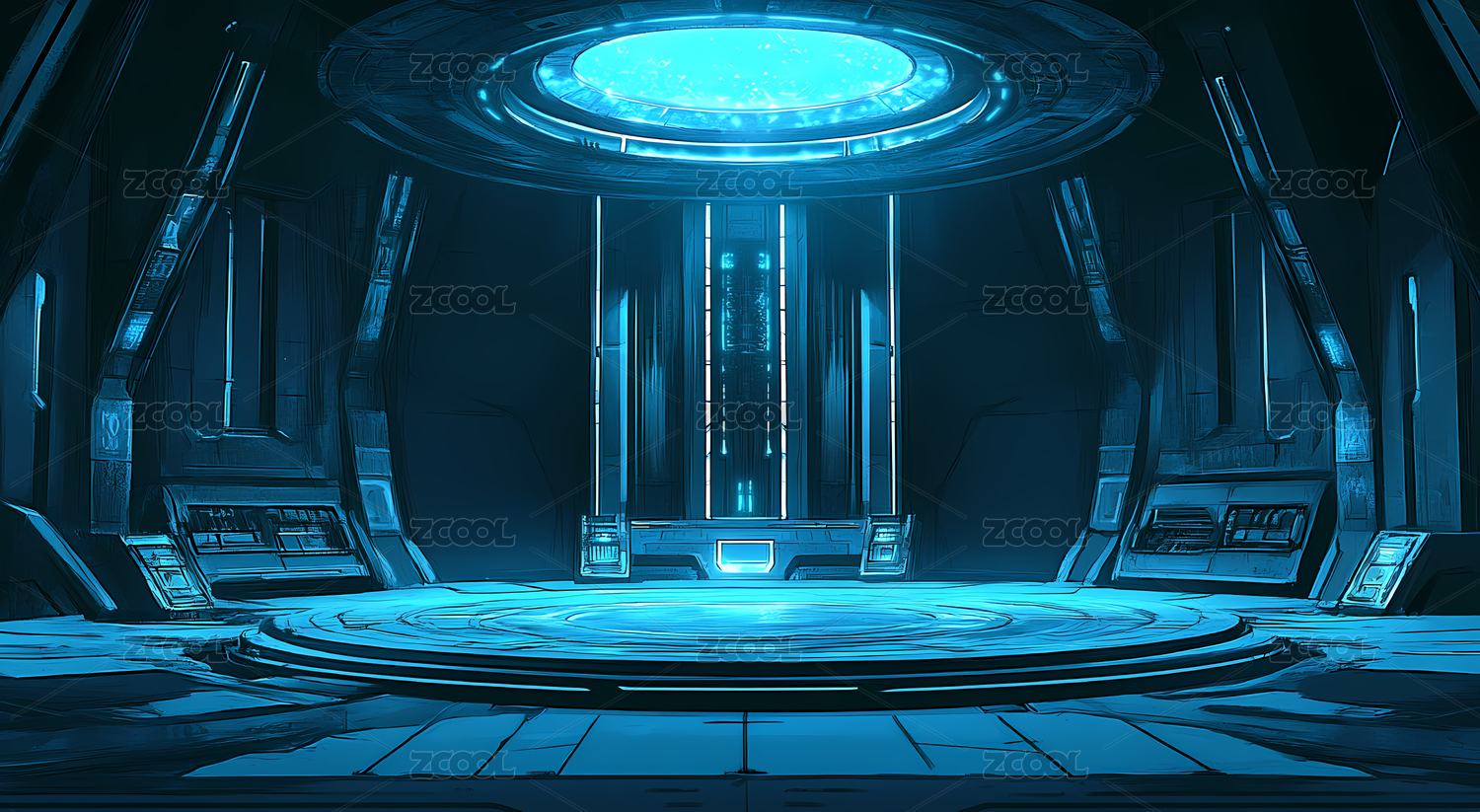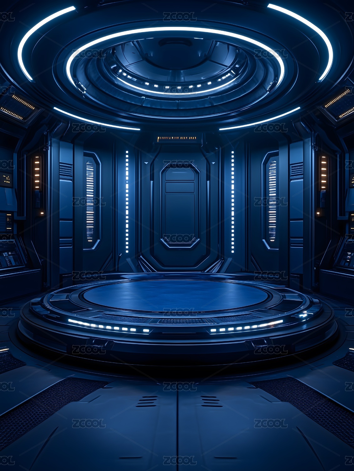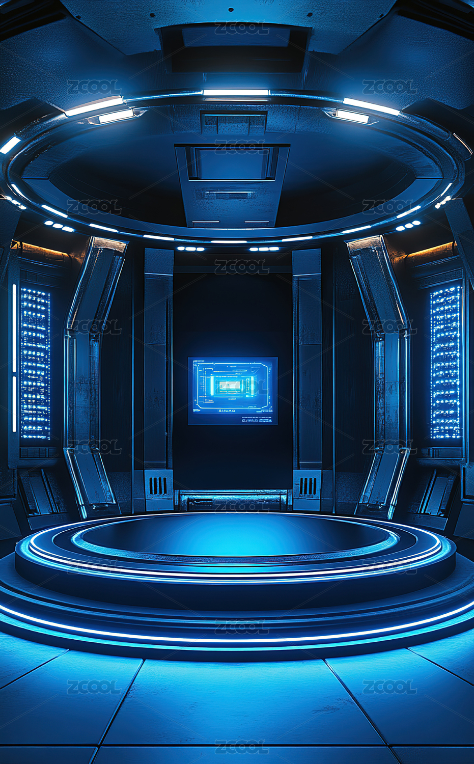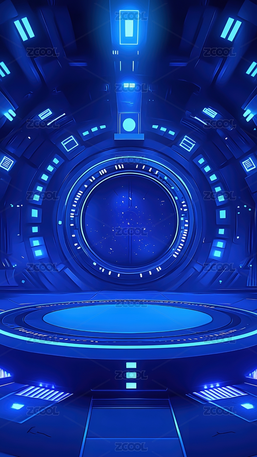 蓝色科幻场景,圆形平台中央,科技感十足