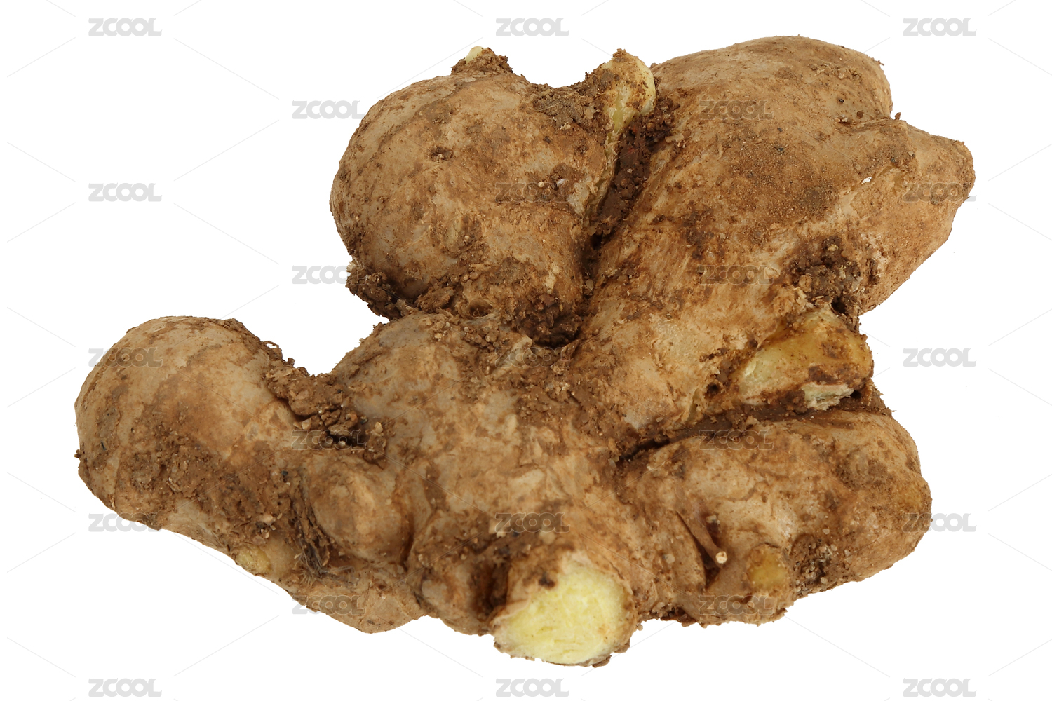 白色背景上摆放的带土生姜