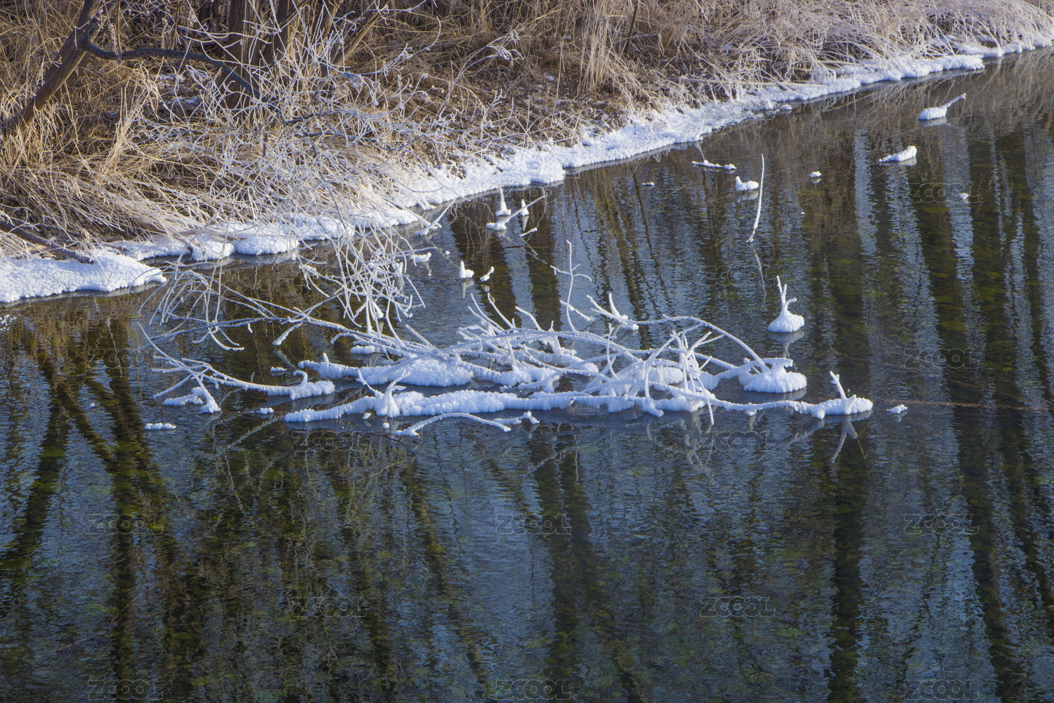 早晨阳光下大雪覆盖下的溪流