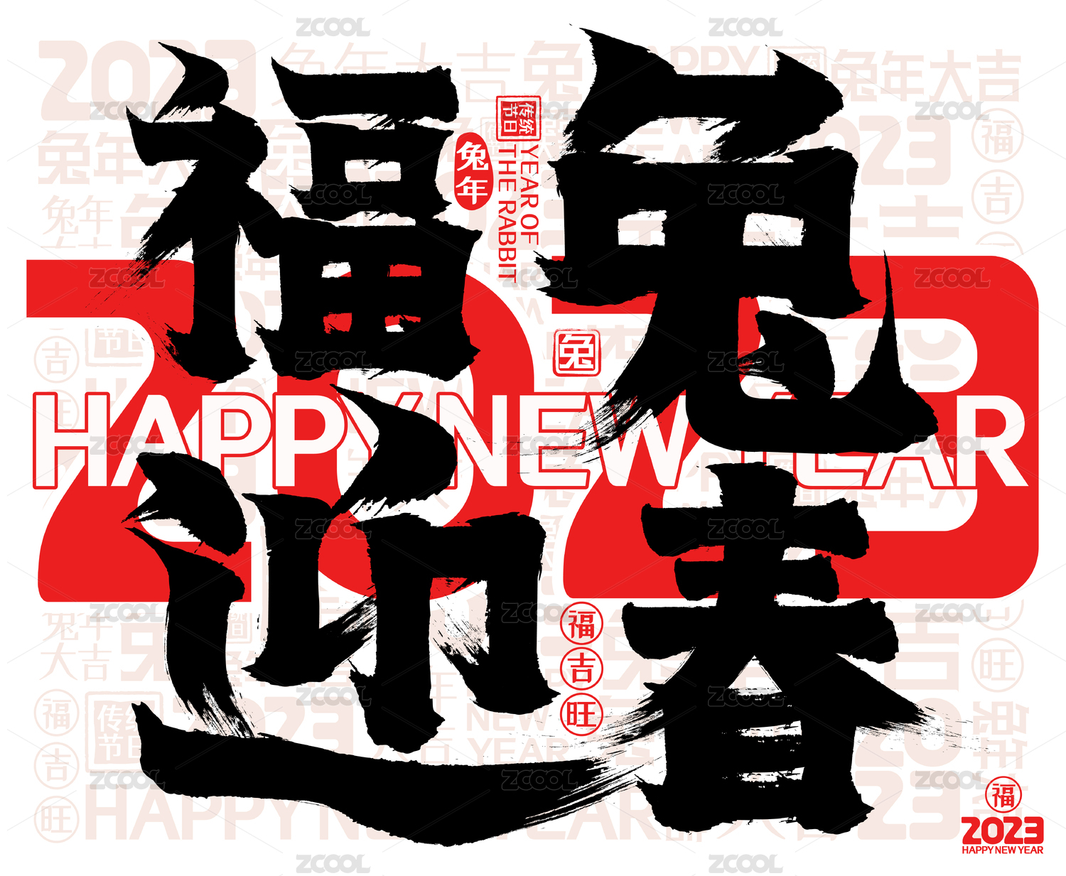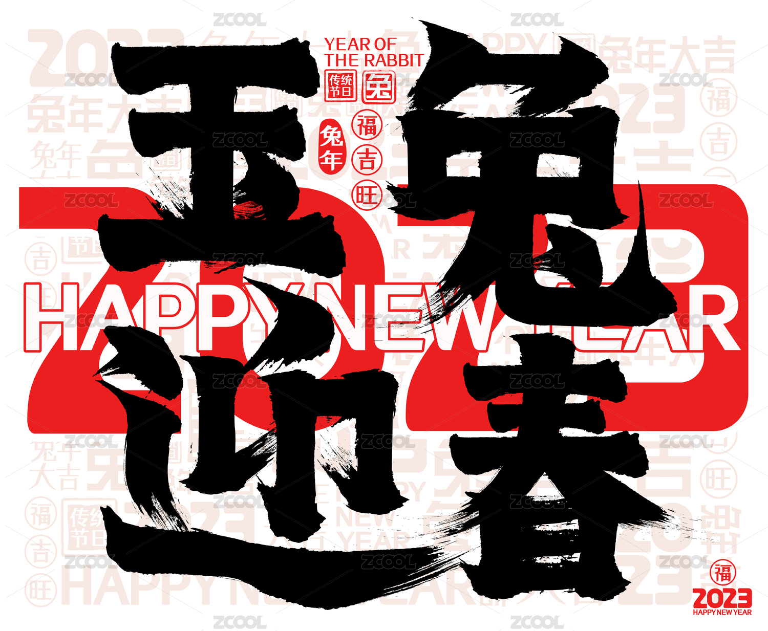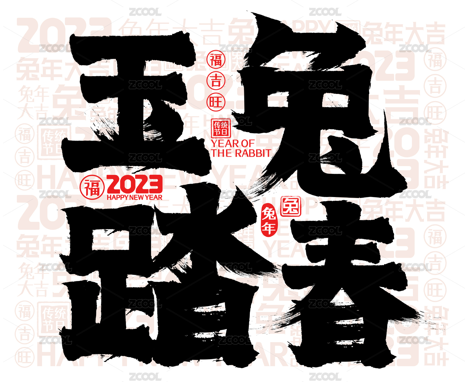 2023玉兔迎春喜庆中国红兔年春节毛笔字