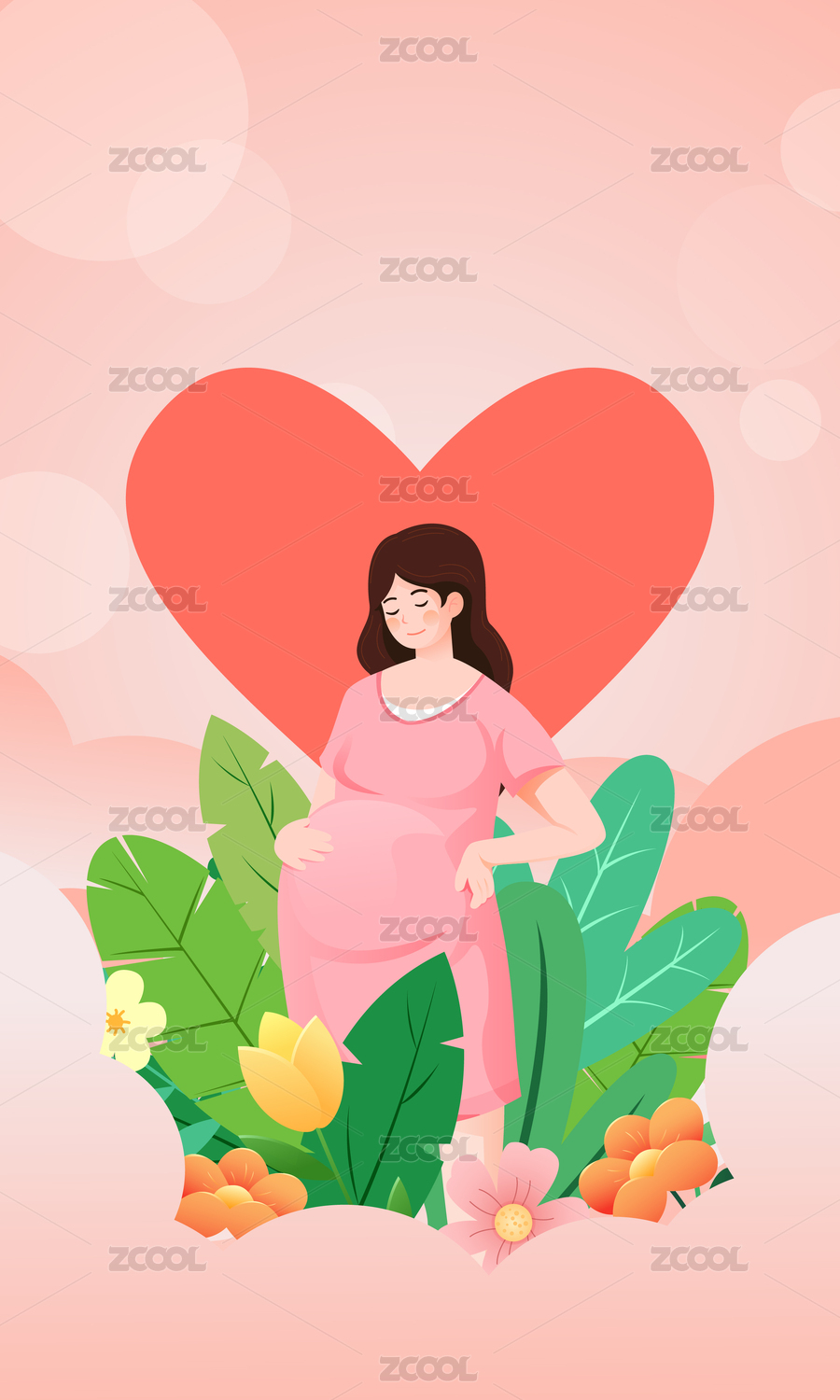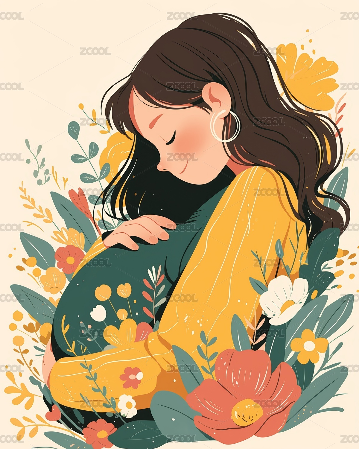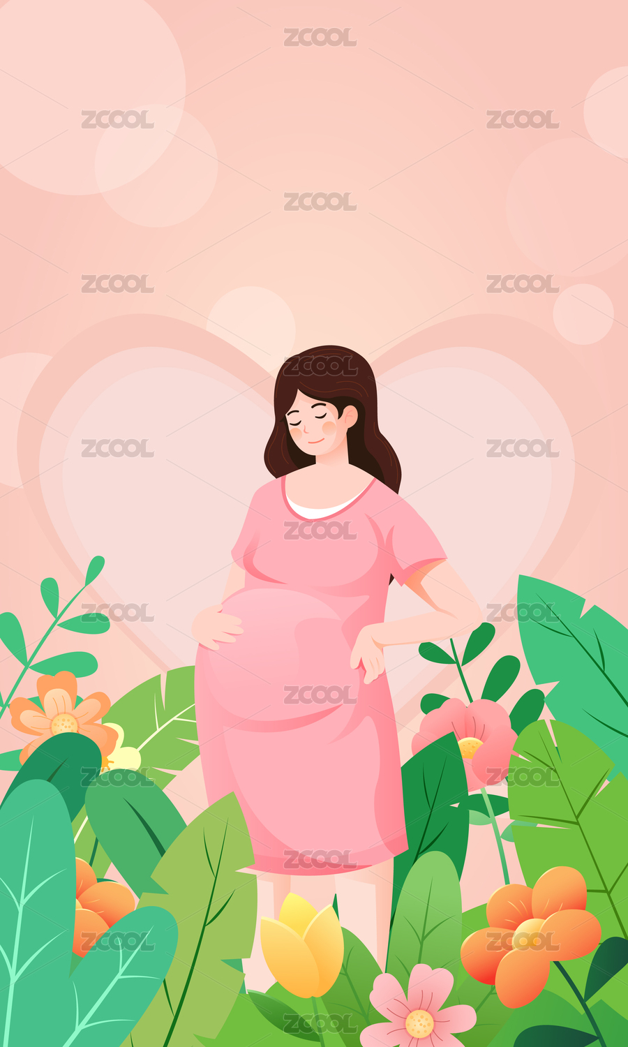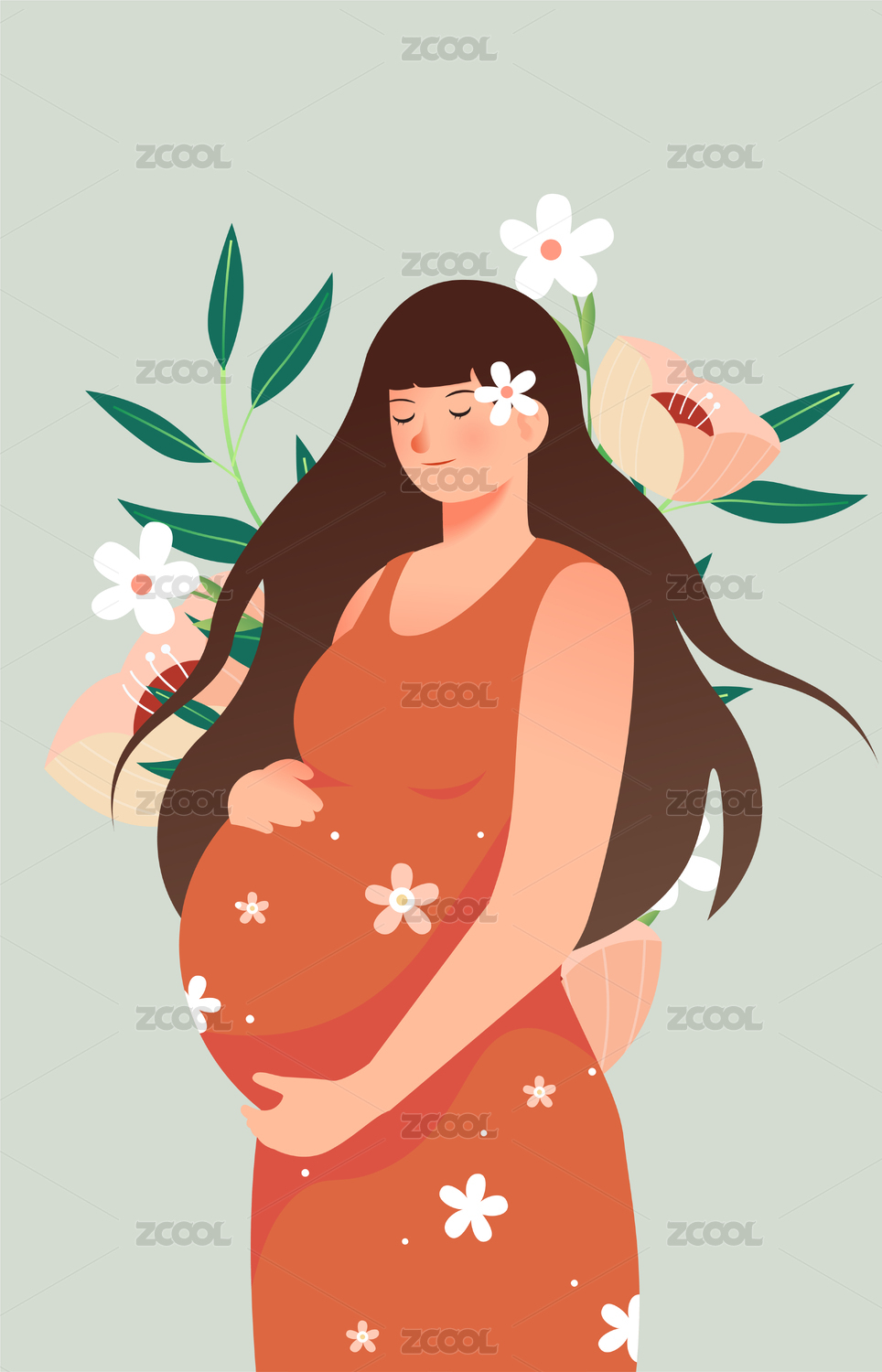 一位穿裙子长发孕妈插画
