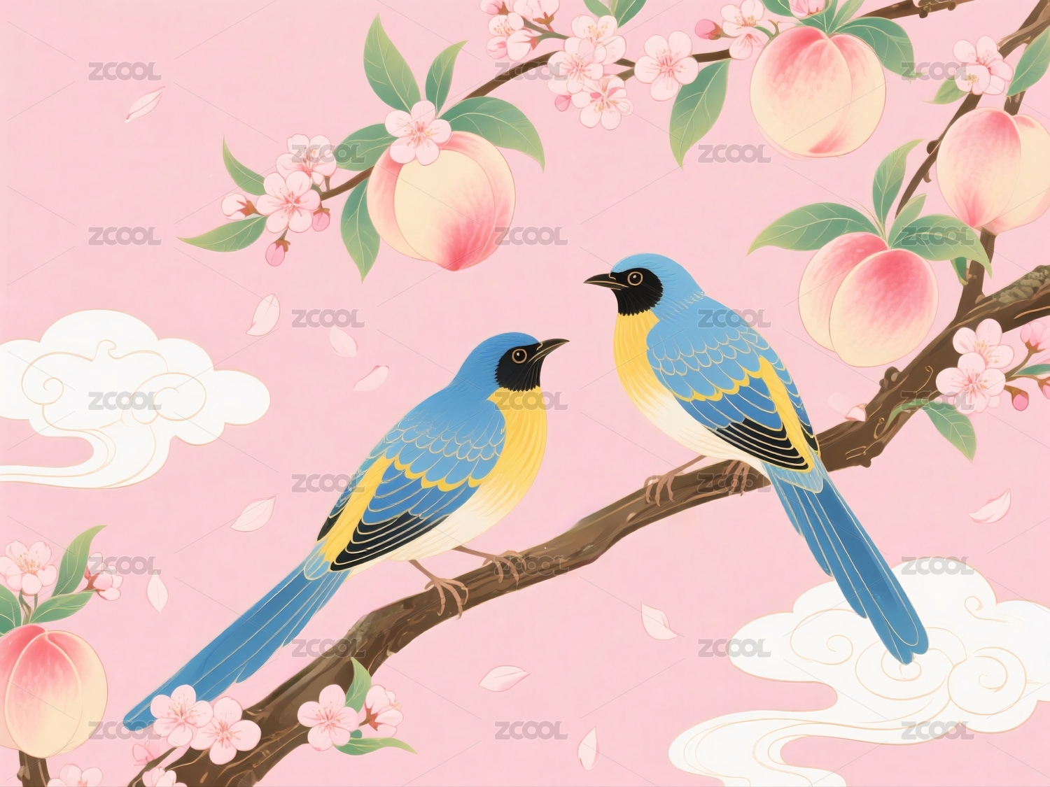 国潮,国风,七夕,喜鹊,桃花,桃枝,祥云,鸟,比翼鸟,花