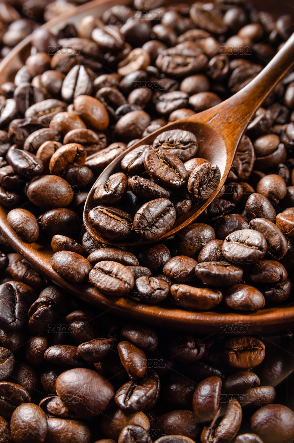 米黄色餐桌布上的勺子,勺子里的咖啡豆