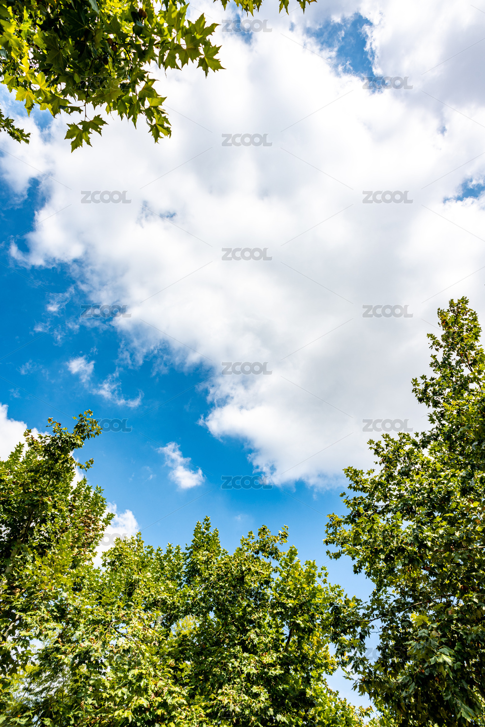 茂密的树林仰望展湛蓝的天空白云朵朵
