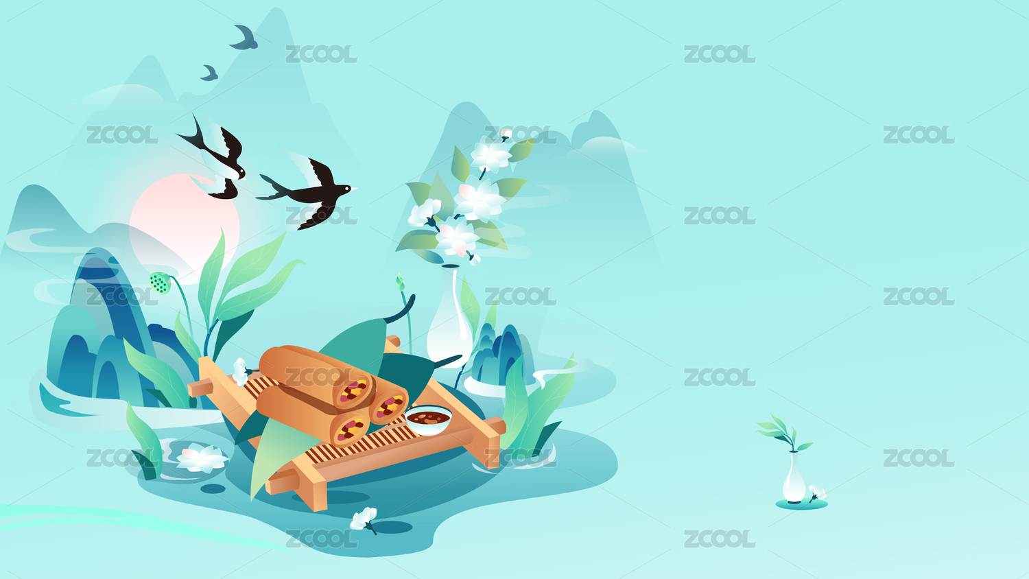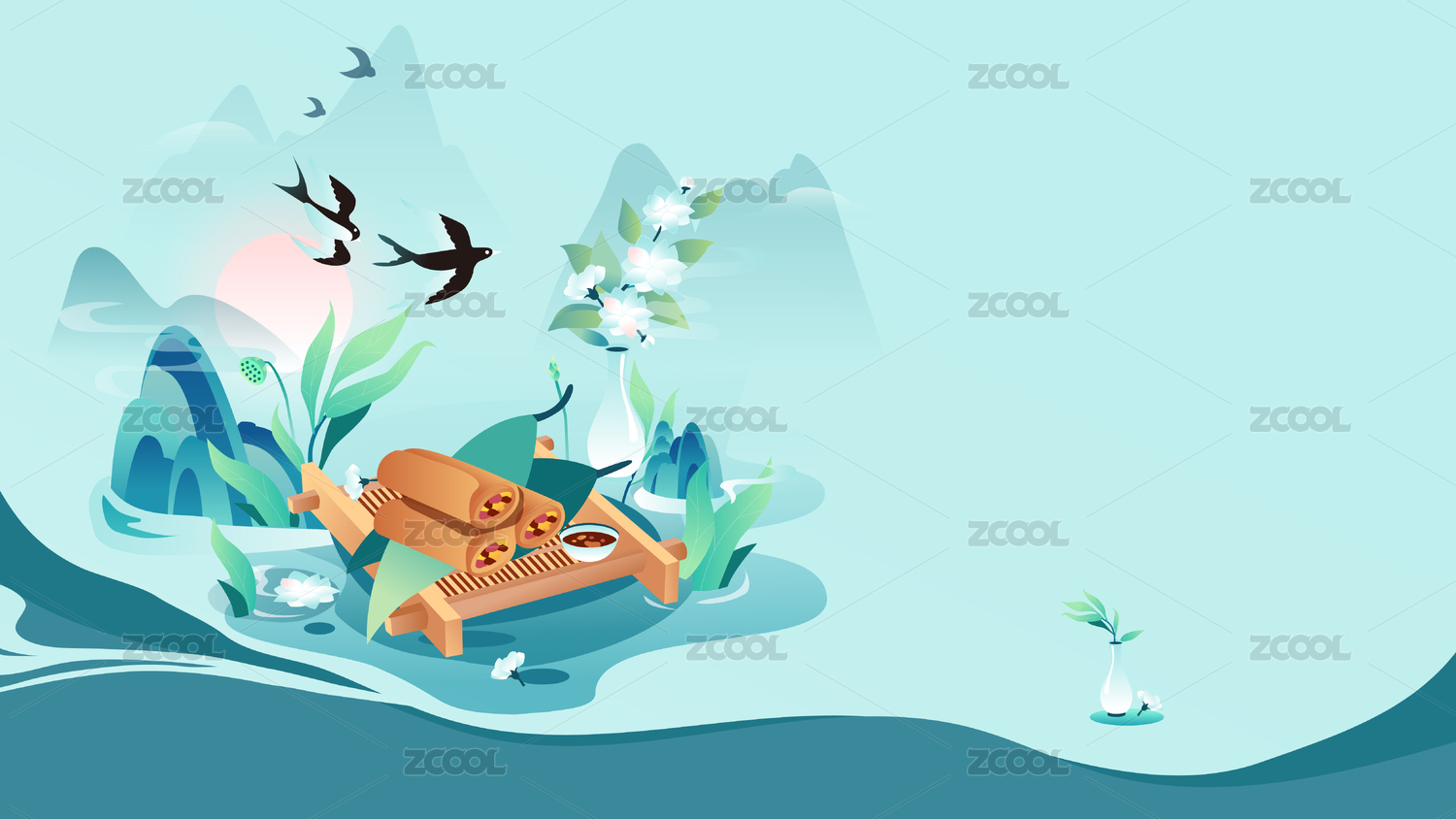国潮古风中式古典彩色花朵燕子环绕山林河流