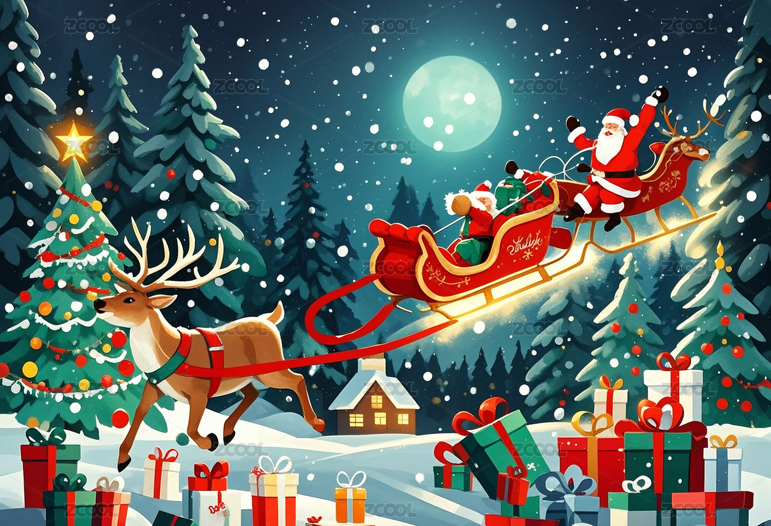 夜晚驯鹿拉雪橇圣诞老人送礼物