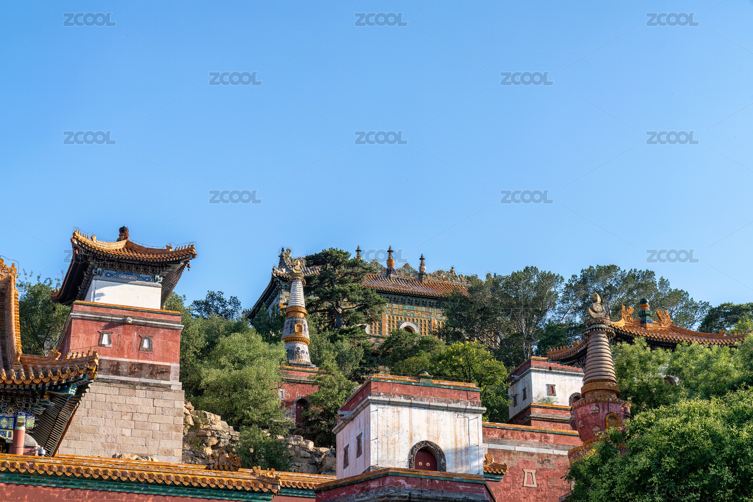 秋天蓝天下的北京颐和园公园的亭台楼阁古建筑