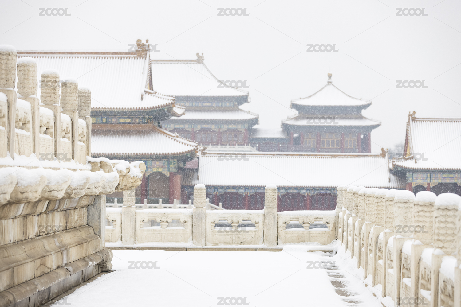北京紫禁城下雪中故宫白茫茫一片的雪景