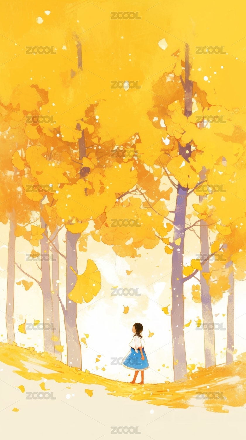 秋季少女与银杏叶插画