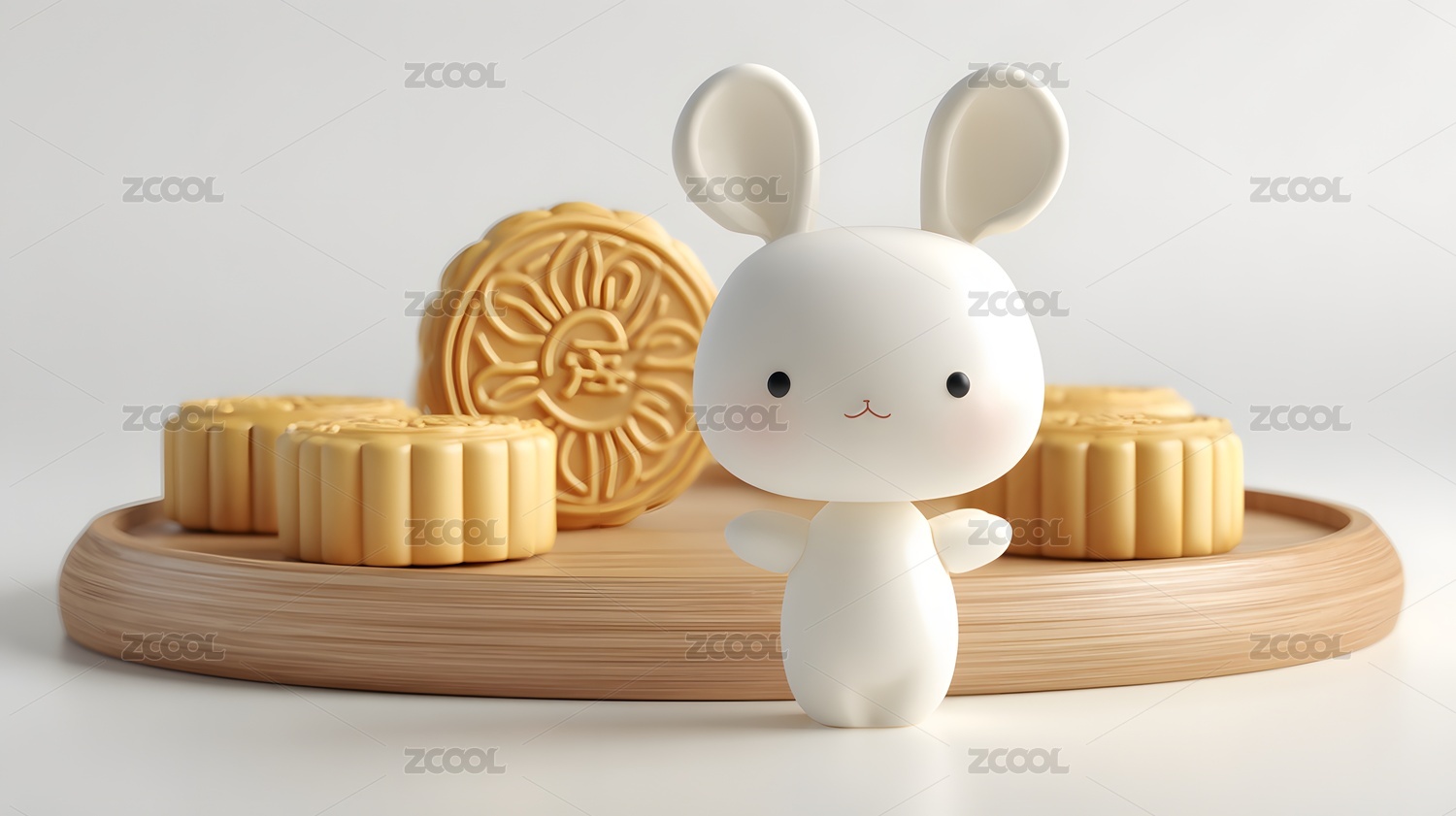 中秋萌兔与木质托盘上的月饼3D插画