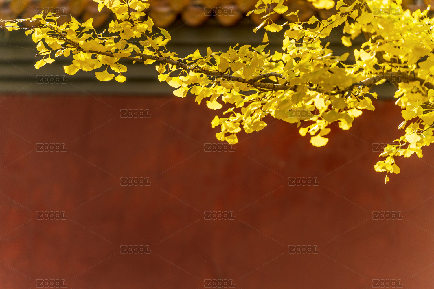 秋天明孝陵红色宫墙外的金黄色银杏树叶