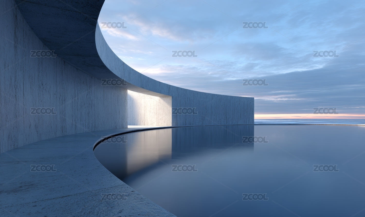 现代混凝土建筑与宁静水池