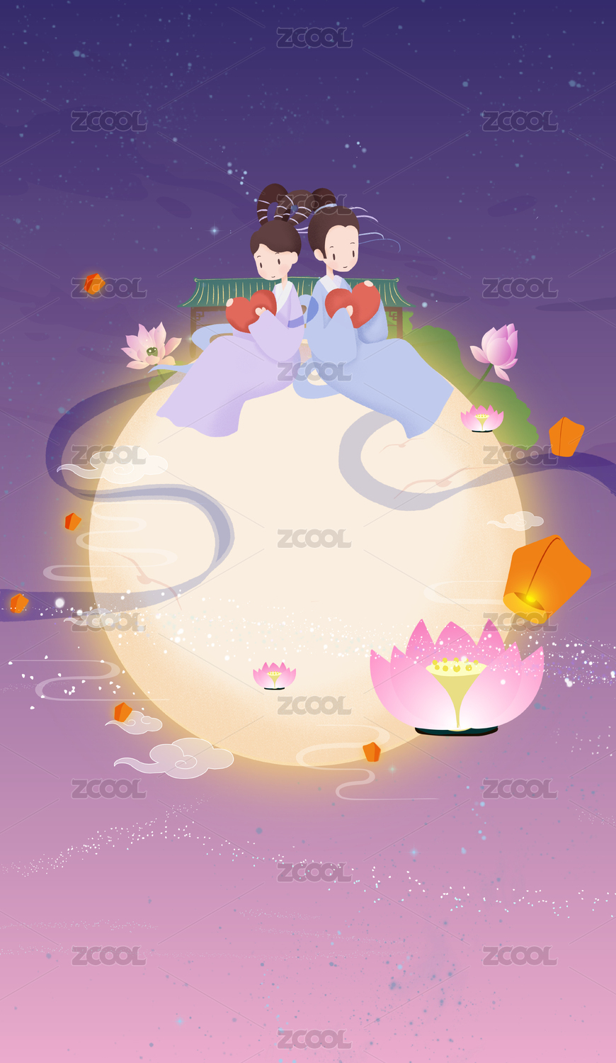 坐在船上的恋人望着月亮 中秋节之夜情侣团圆梦幻中秋节插画