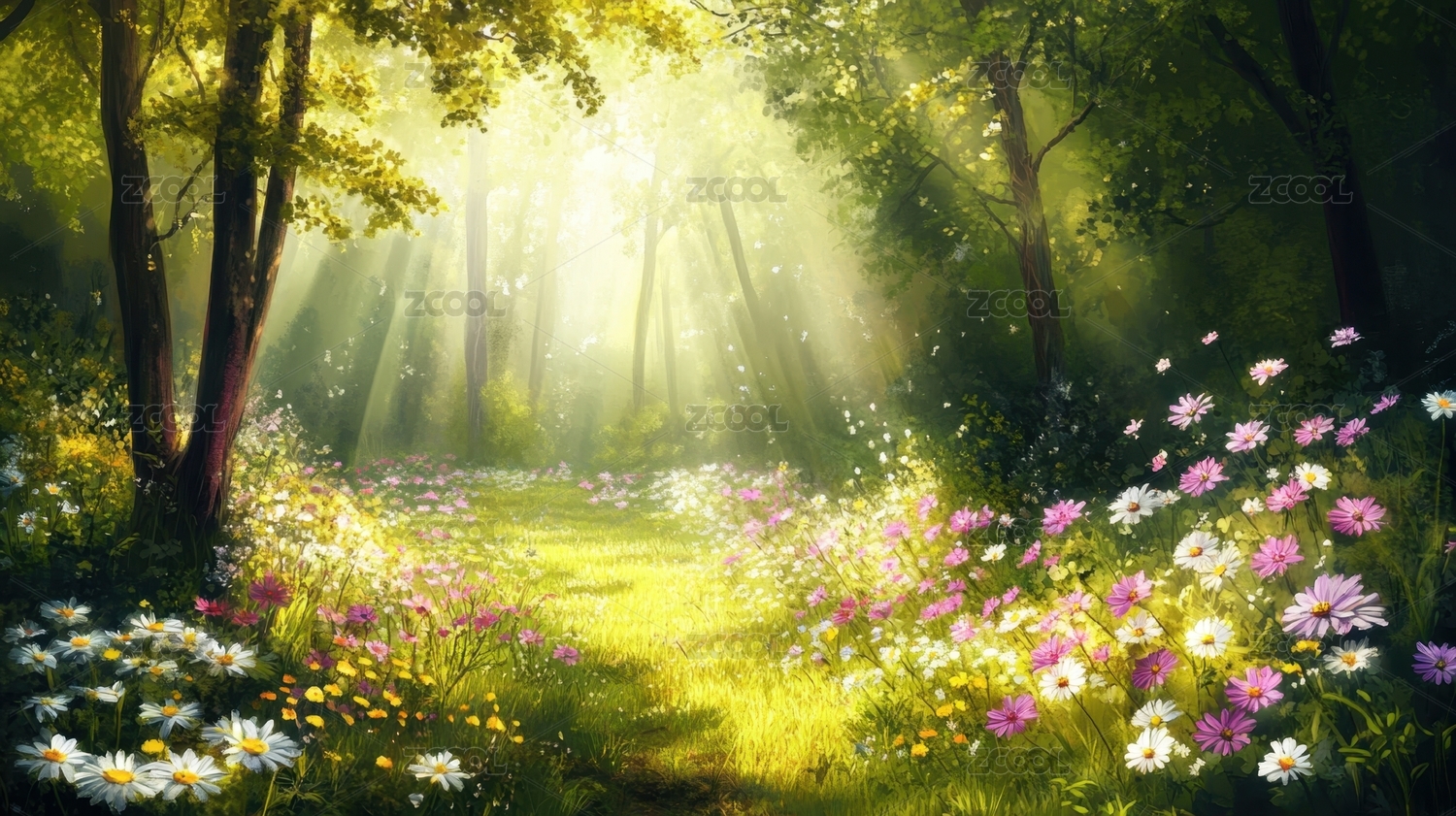 阳光透过树林洒满草地