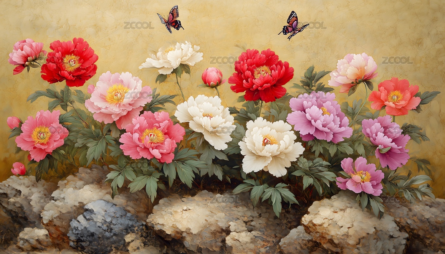 艳丽牡丹竞相绽放,彩蝶翩跹起舞