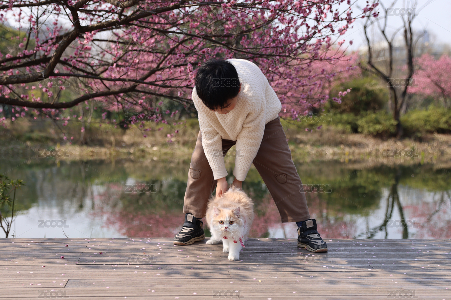 小男孩与宠物猫在梅花树下互动的温馨场景