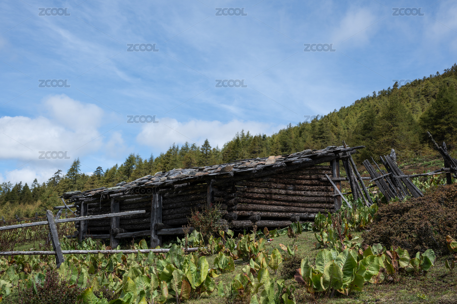 中国新疆喀纳斯风景区蓝天白云下的木屋