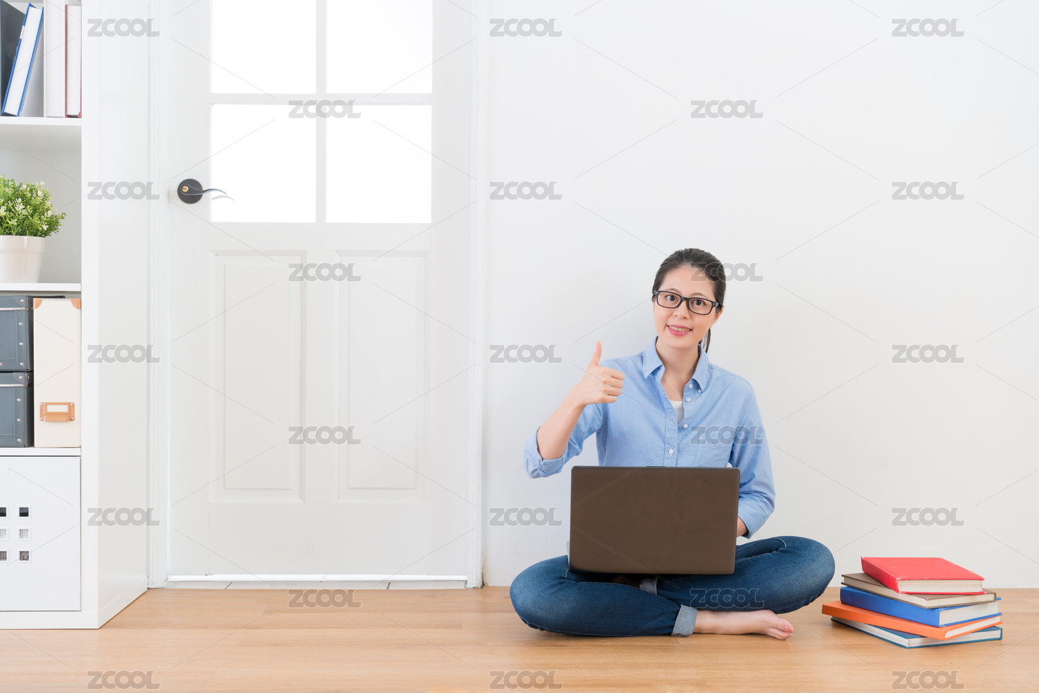 有魅力的女人使用电脑做有白色背景好主意学习功课在家里坐在木地板。