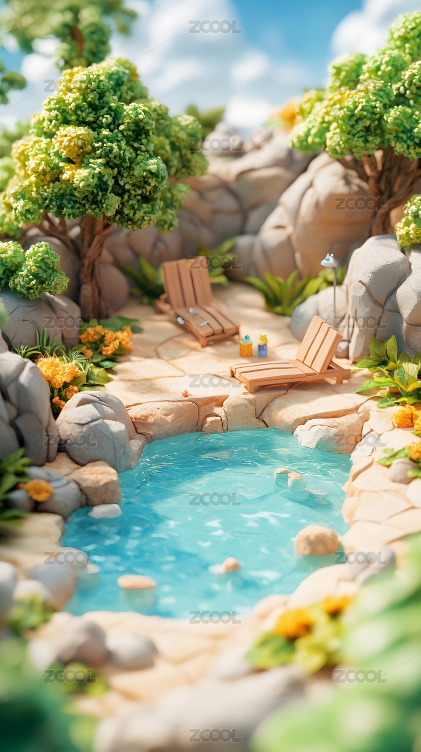 夏天绿色生机的山间小溪3D卡通立体插画