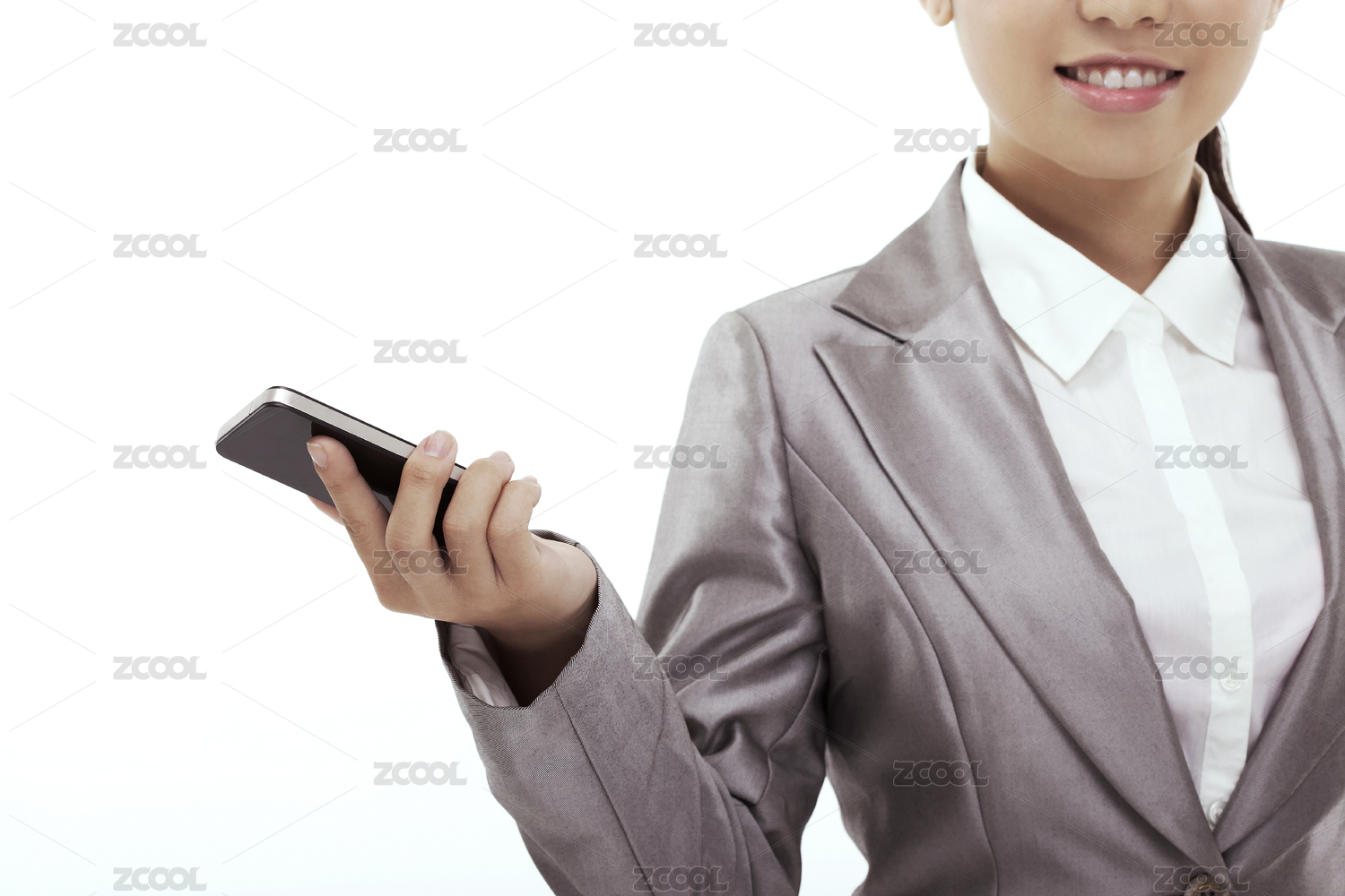 影棚拍摄,活泼美丽女学生展示留白移动电话