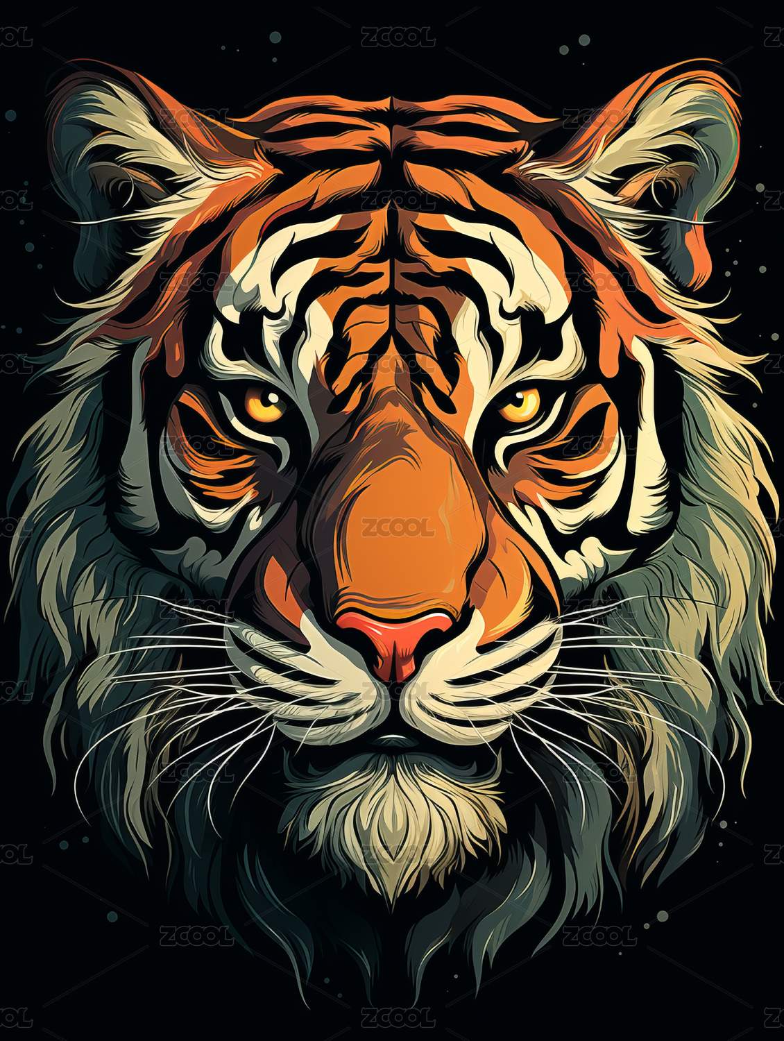 抽象线条感老虎头T恤图案美式暗黑风格插画