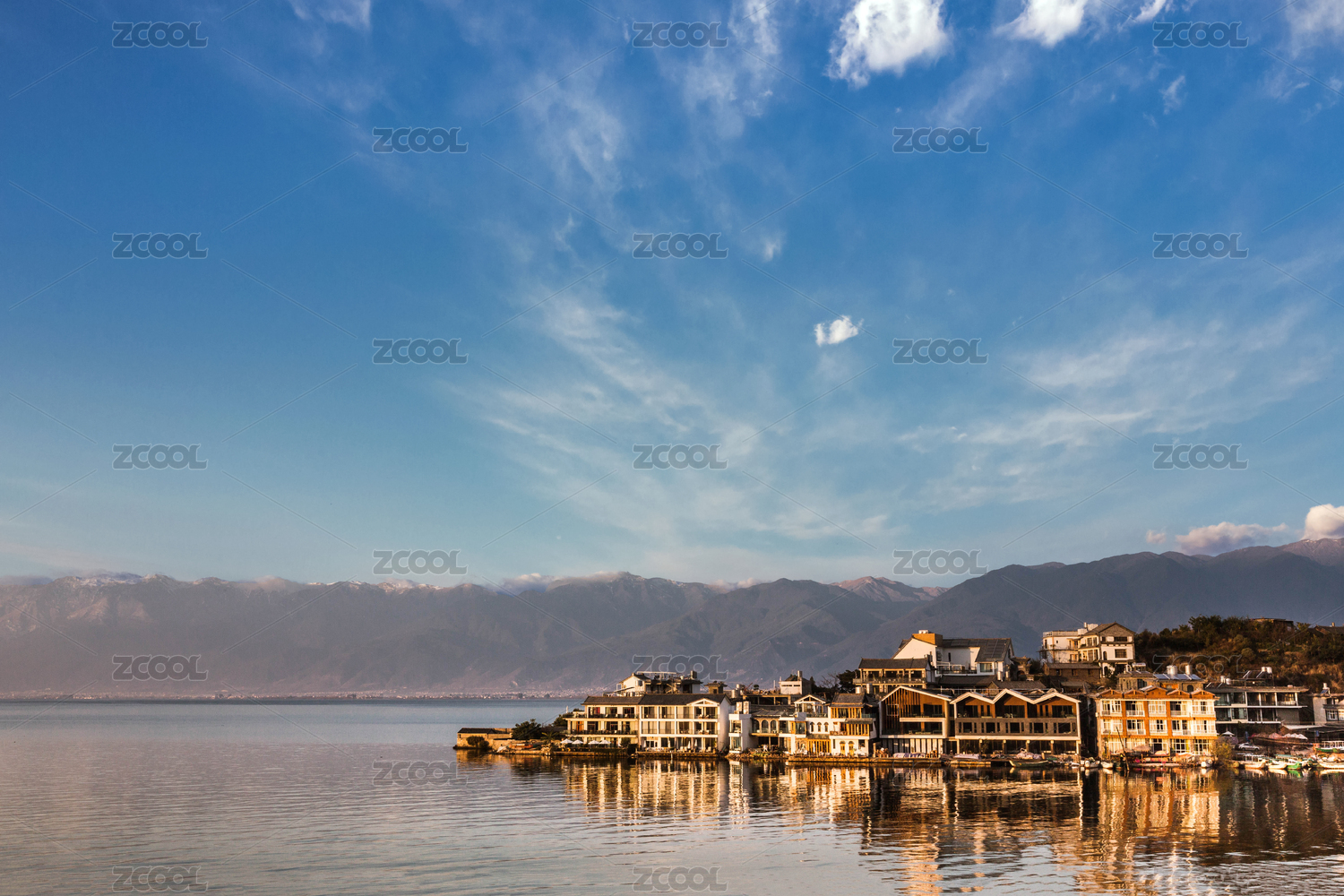 清晨阳光中的中国云南省大理市洱海湖畔的双廊镇民居