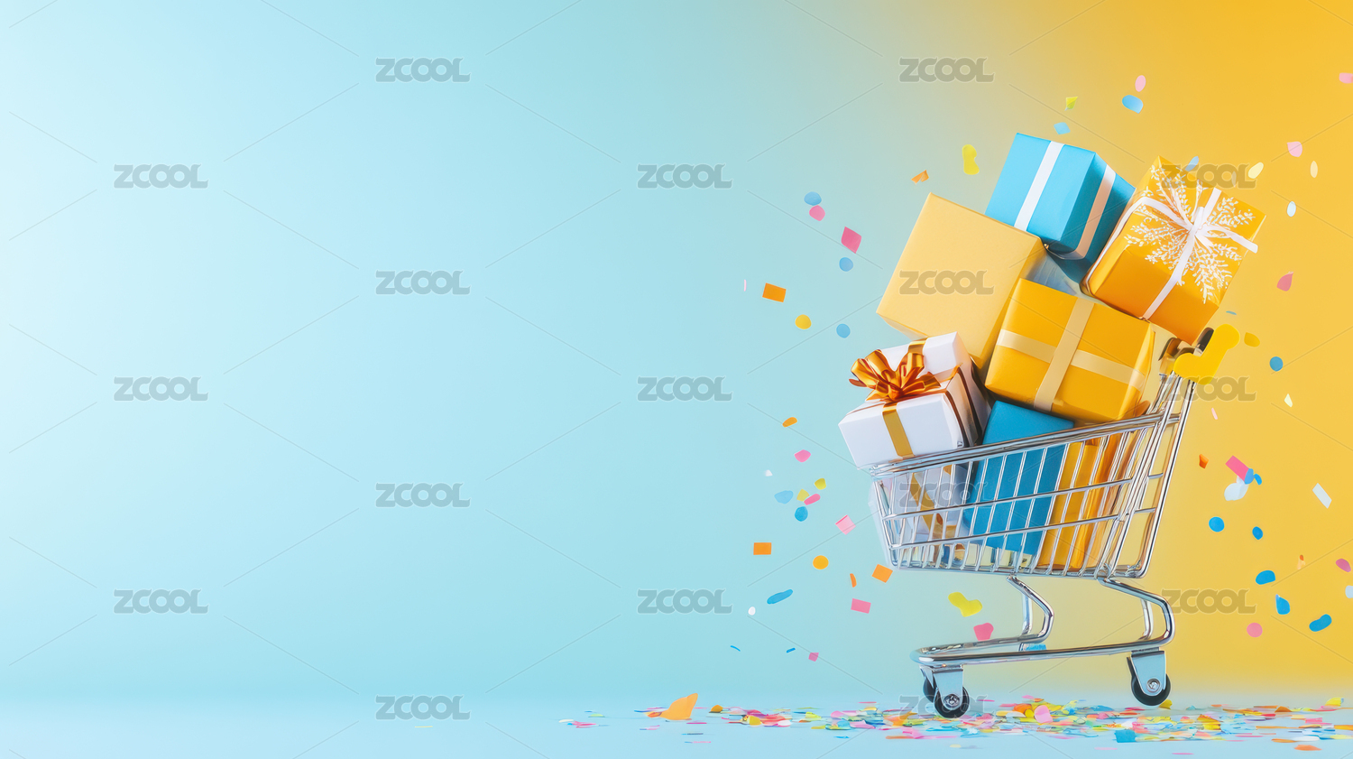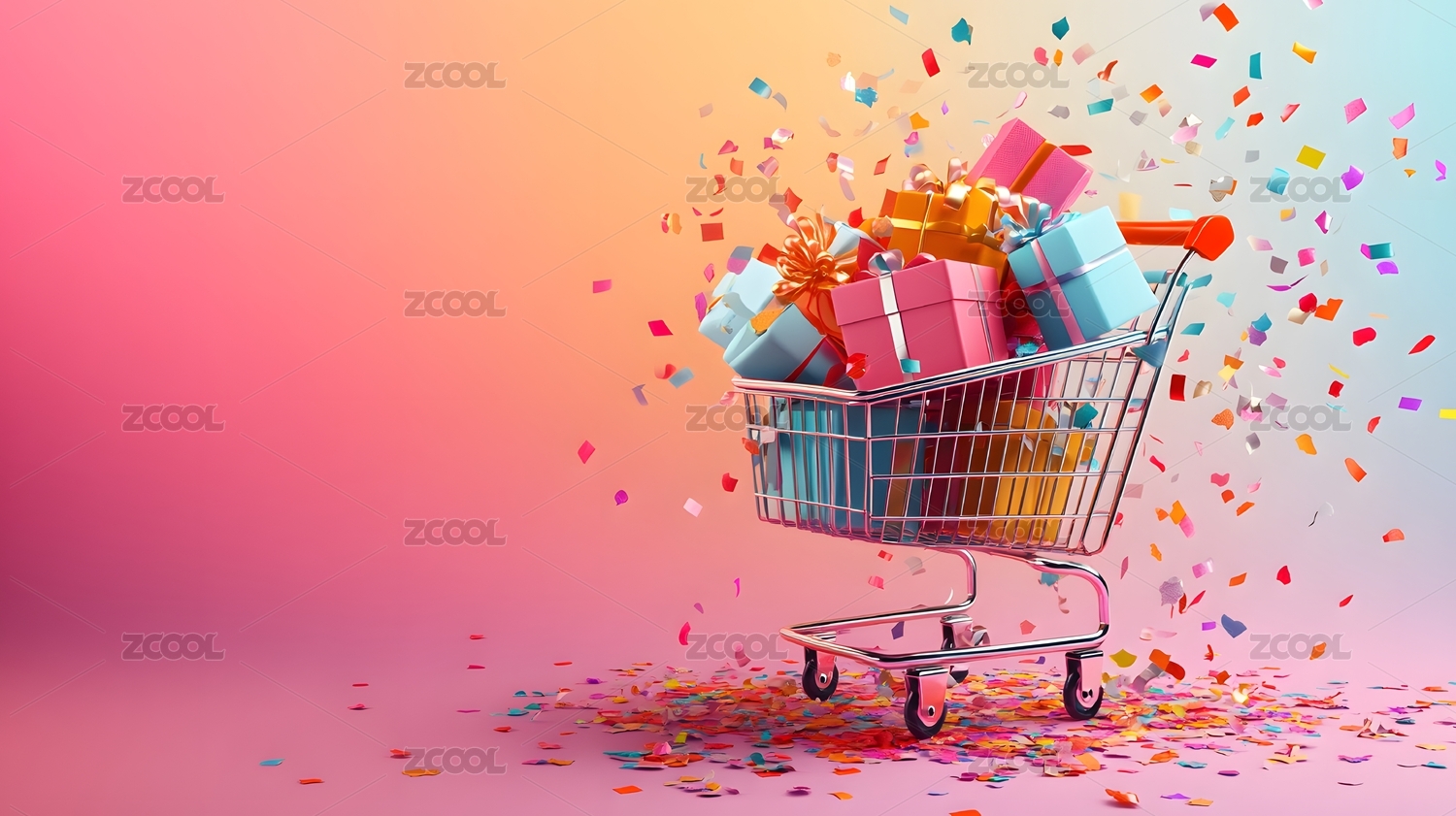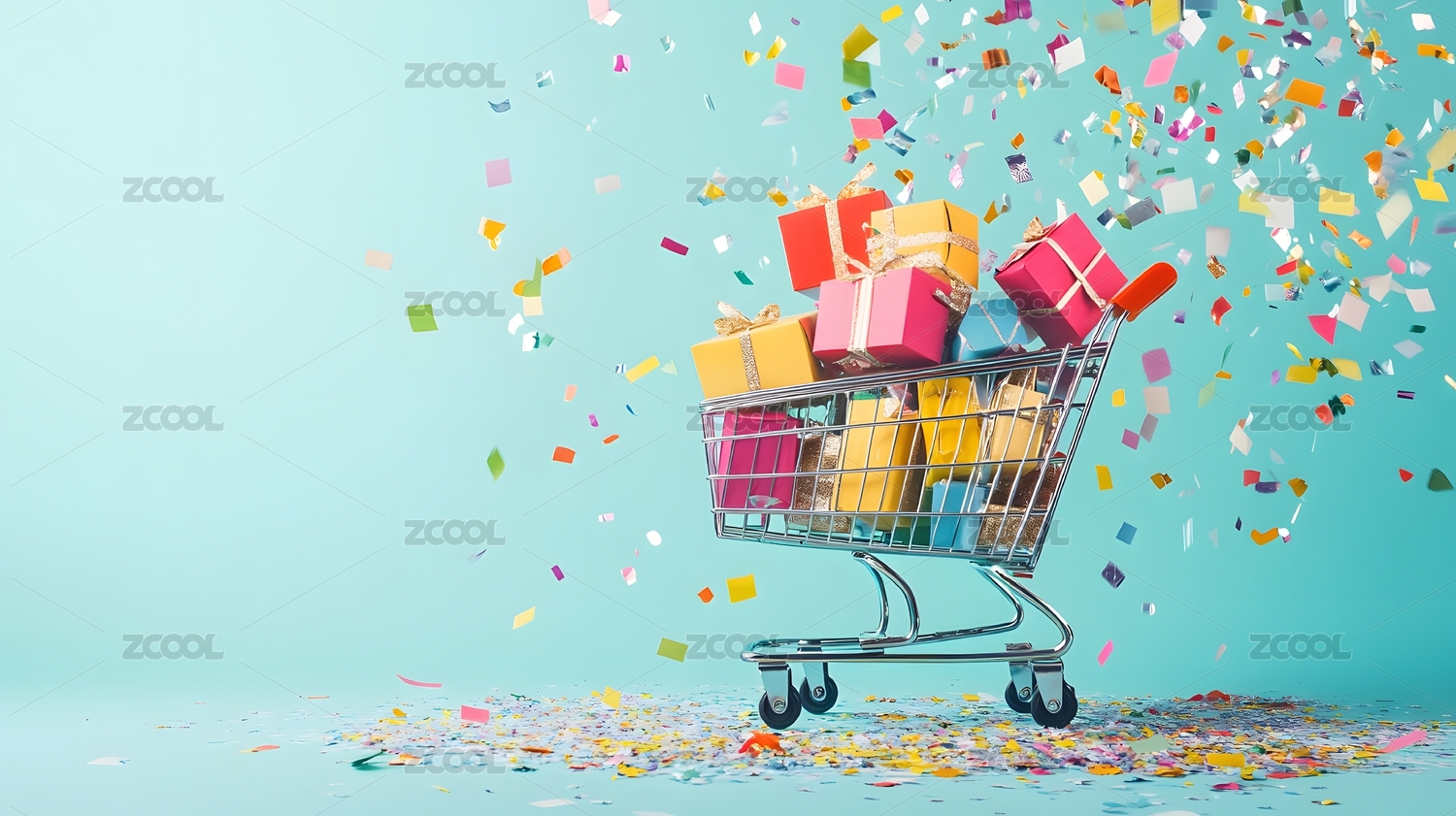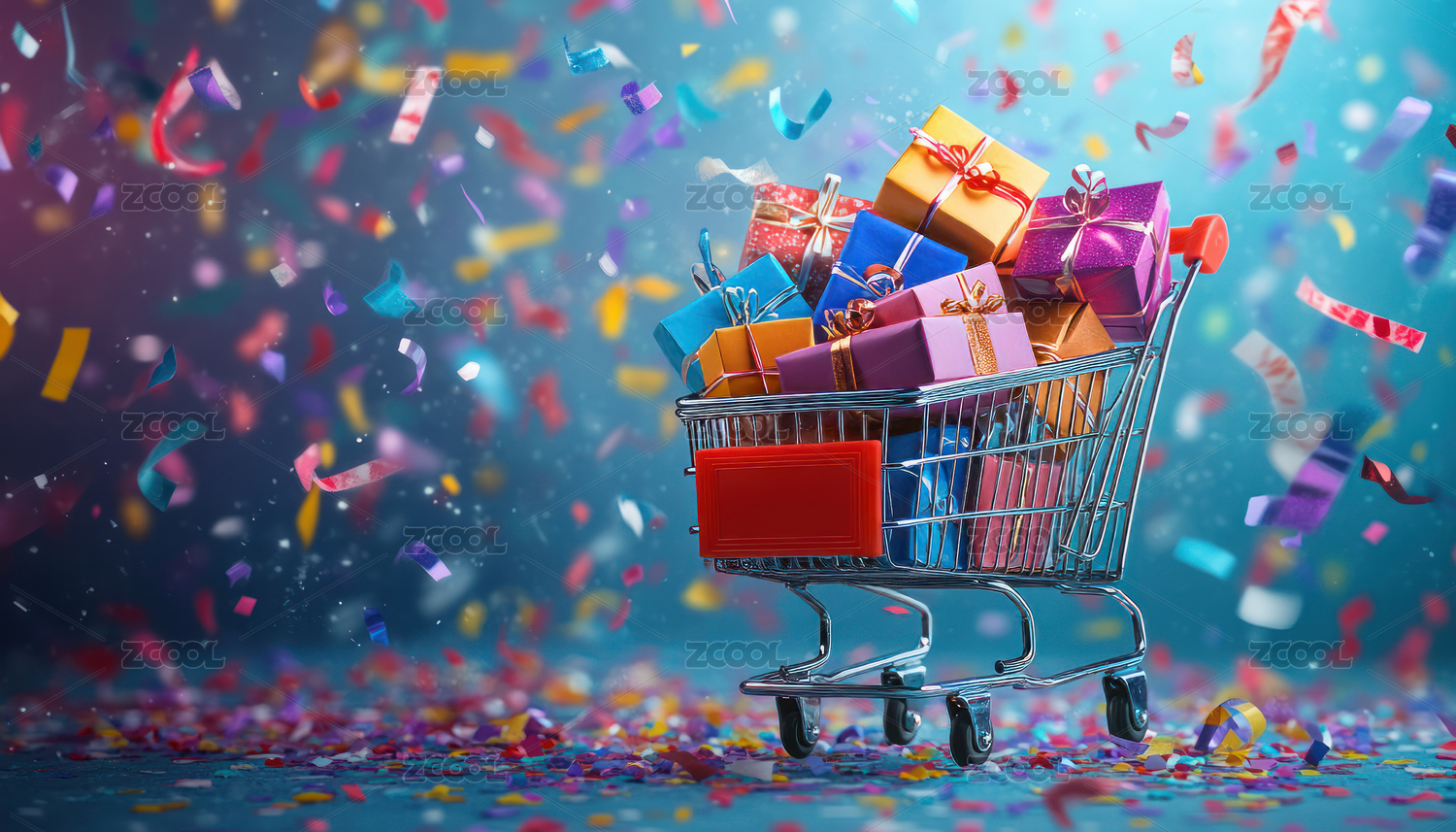 购物车中的礼物盒和五彩纸屑