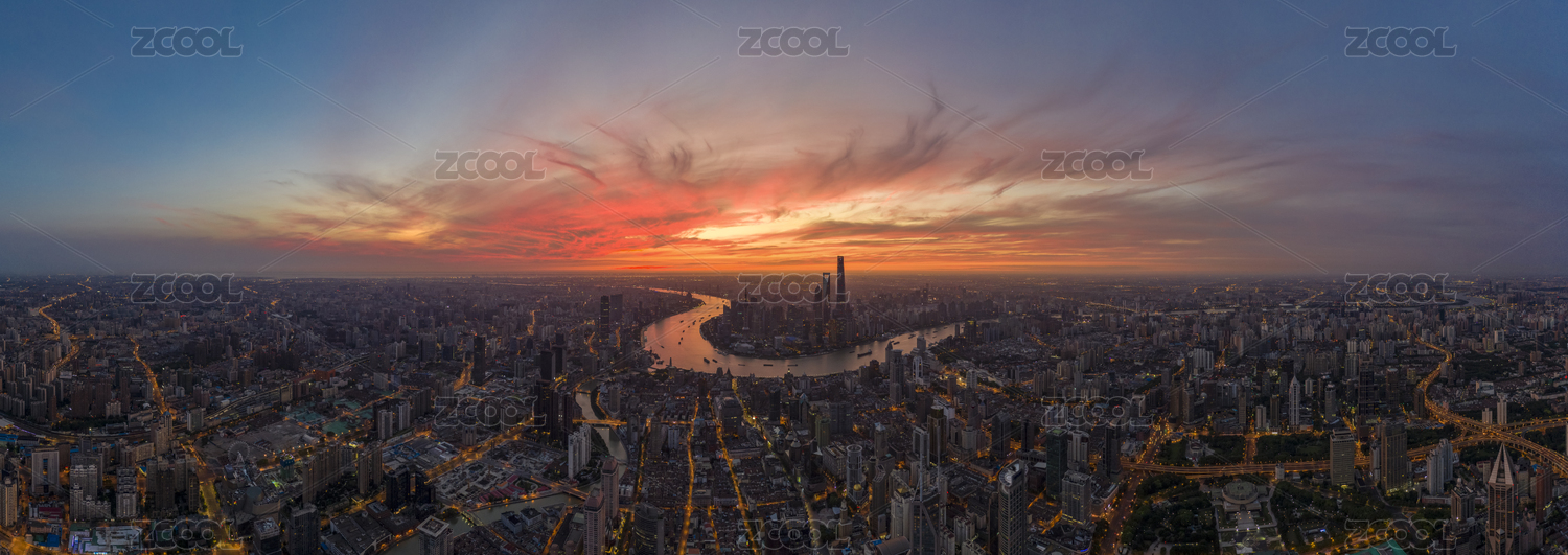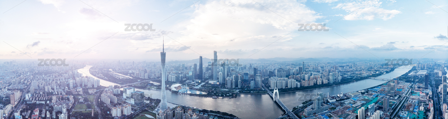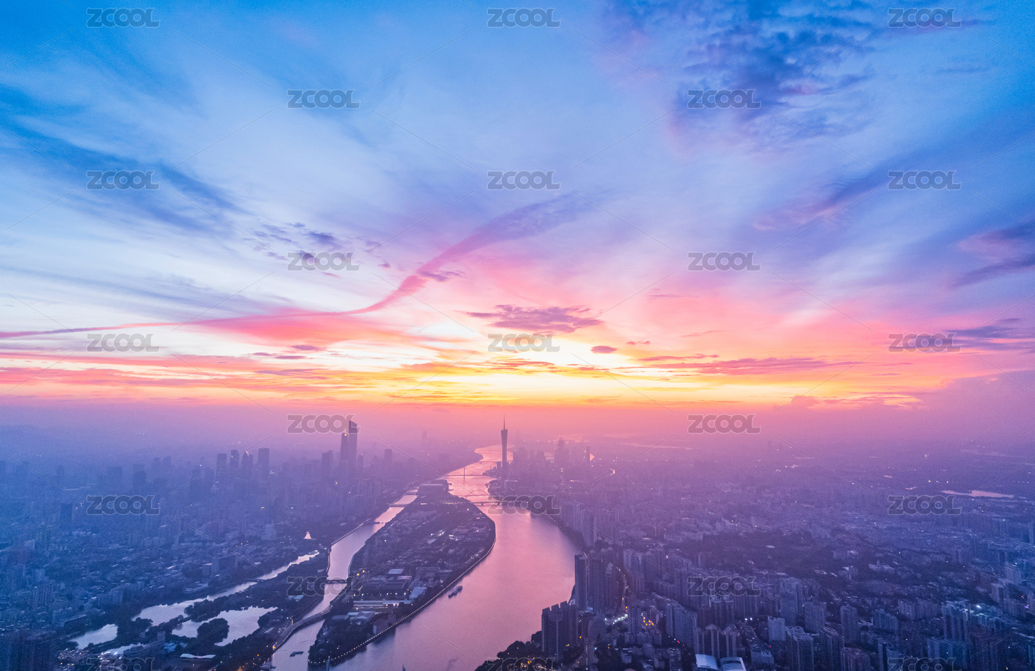 广州珠江岸城市建筑群与日出云彩航拍长图