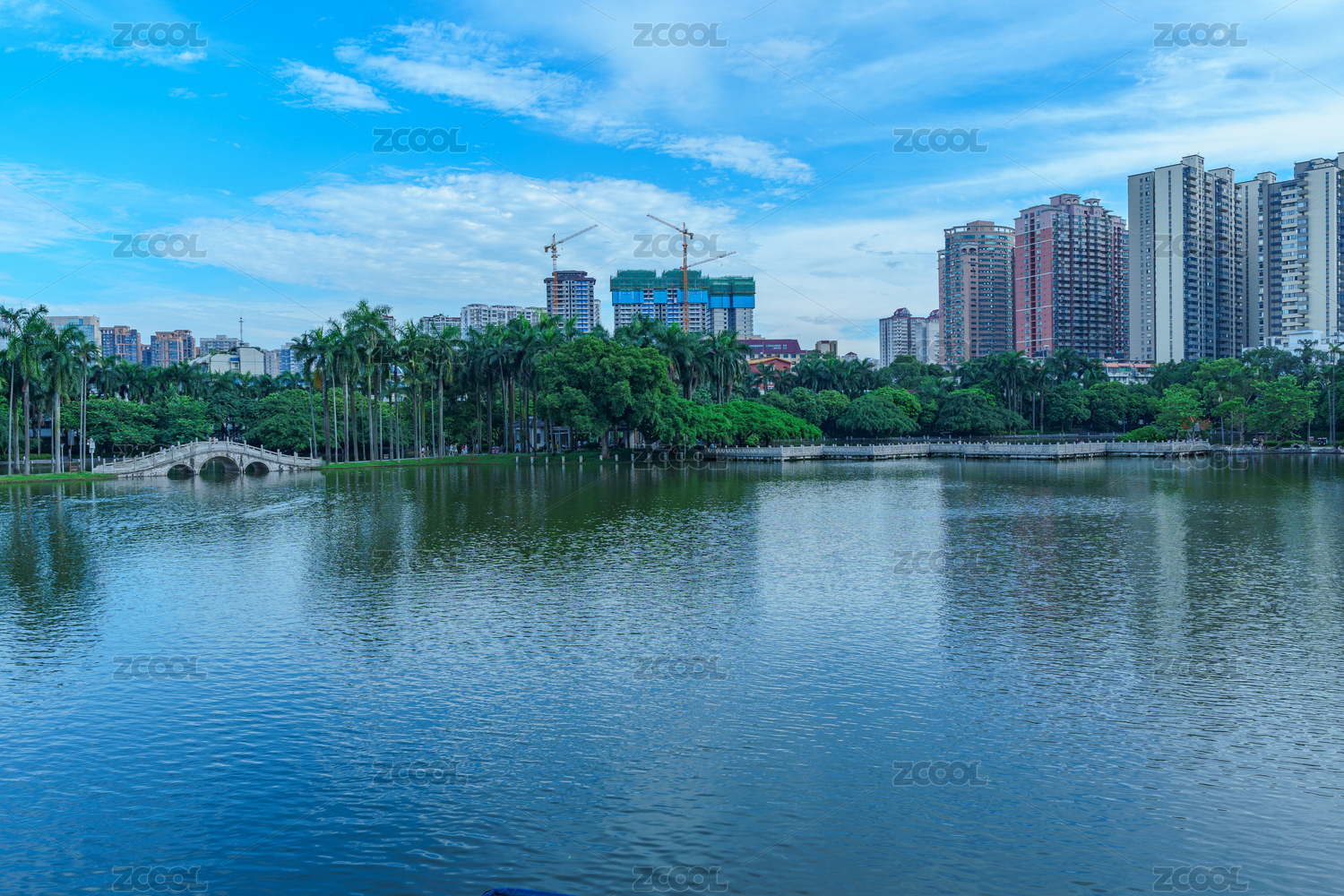 广西南宁市人民公园湖泊树林与城市建筑全景