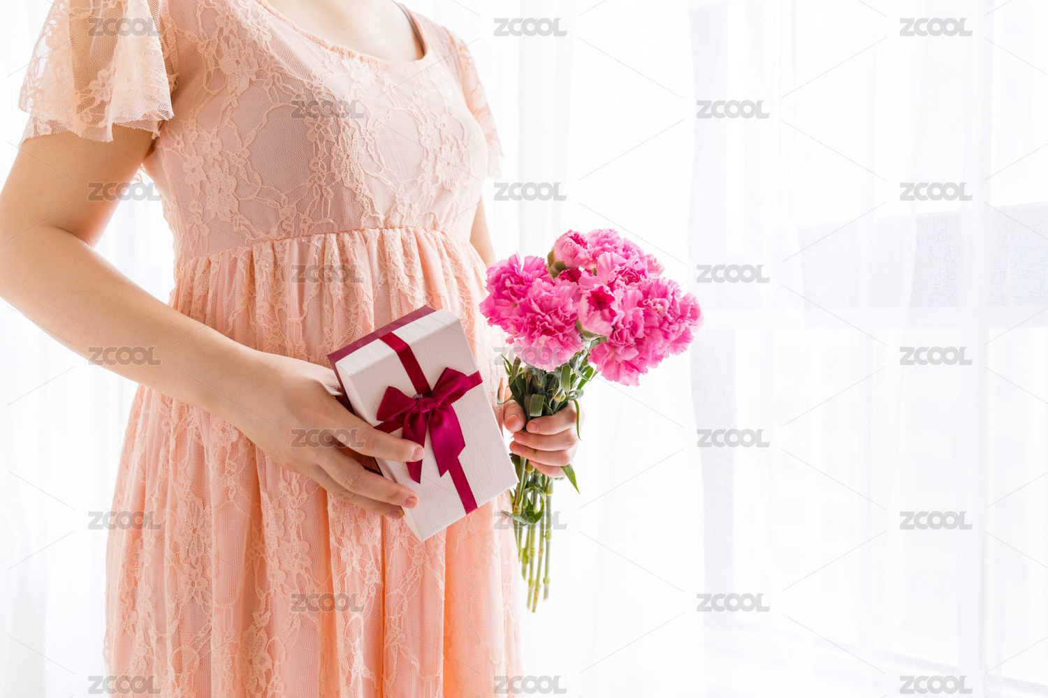 年轻孕妇拿着一束康乃馨和一个礼物盒