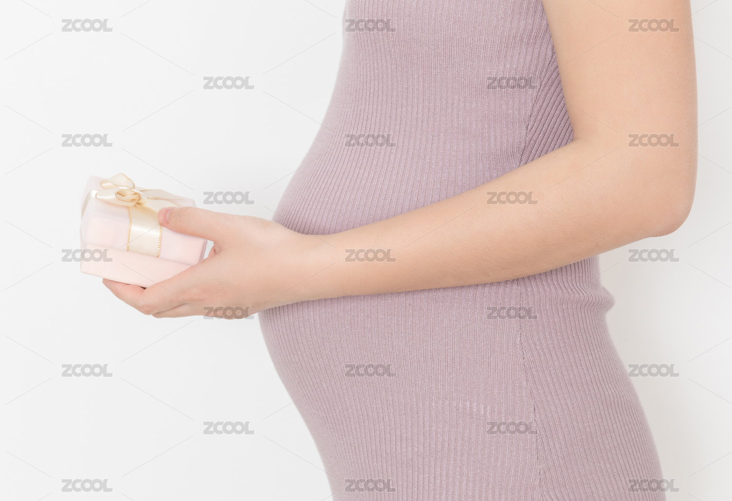 身穿紫色针织裙的年轻孕妇手拿着一个礼物盒