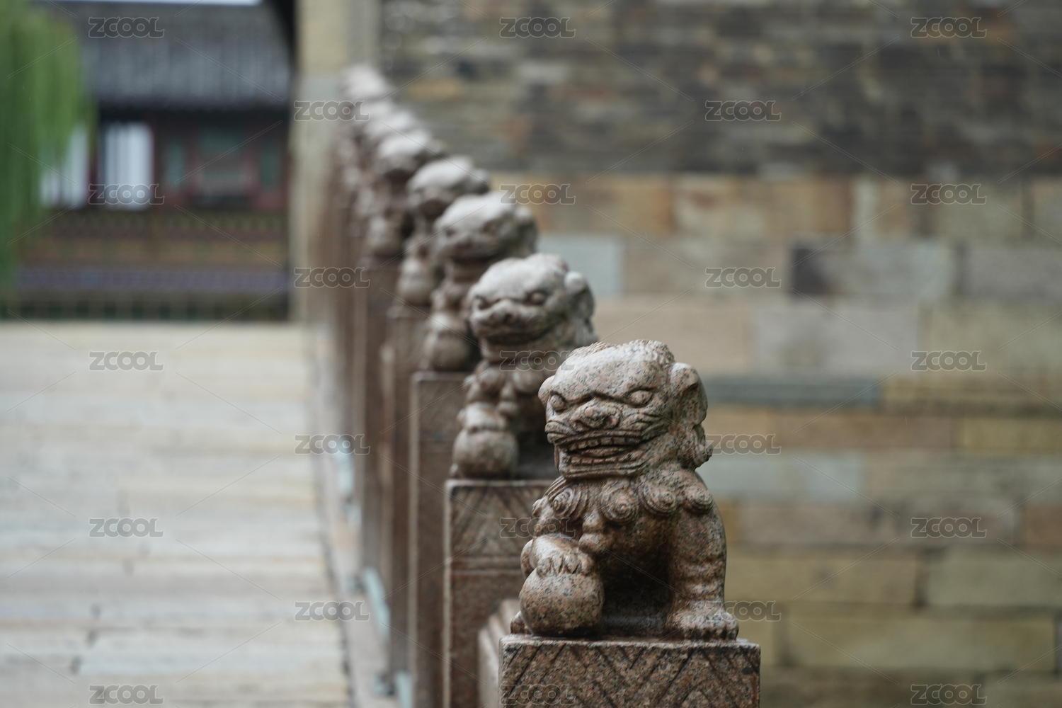 中国中式建筑门前的一头威武雄壮的石狮子正面