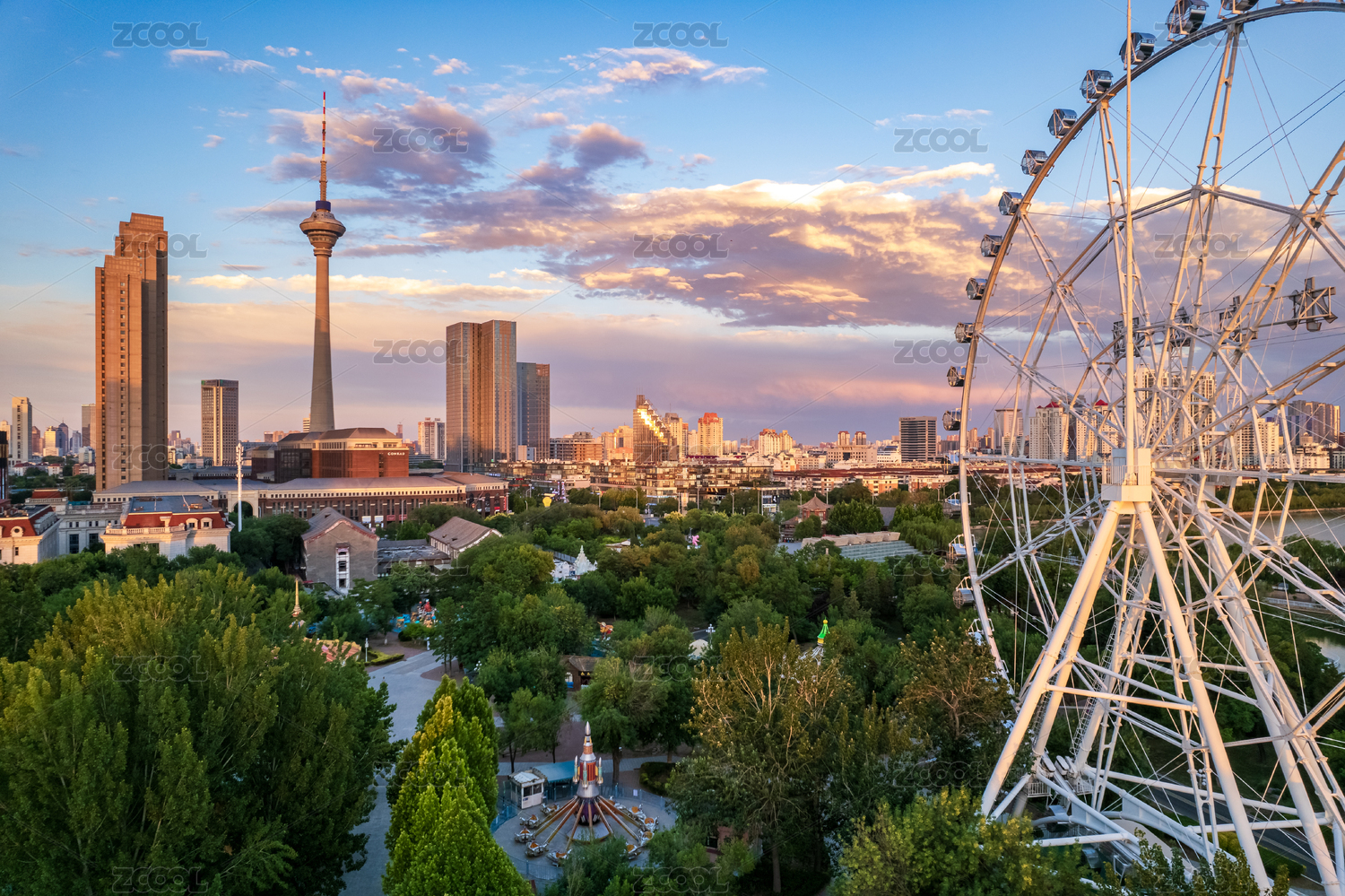 天津水上公园电视塔日落晚霞城市建筑风景