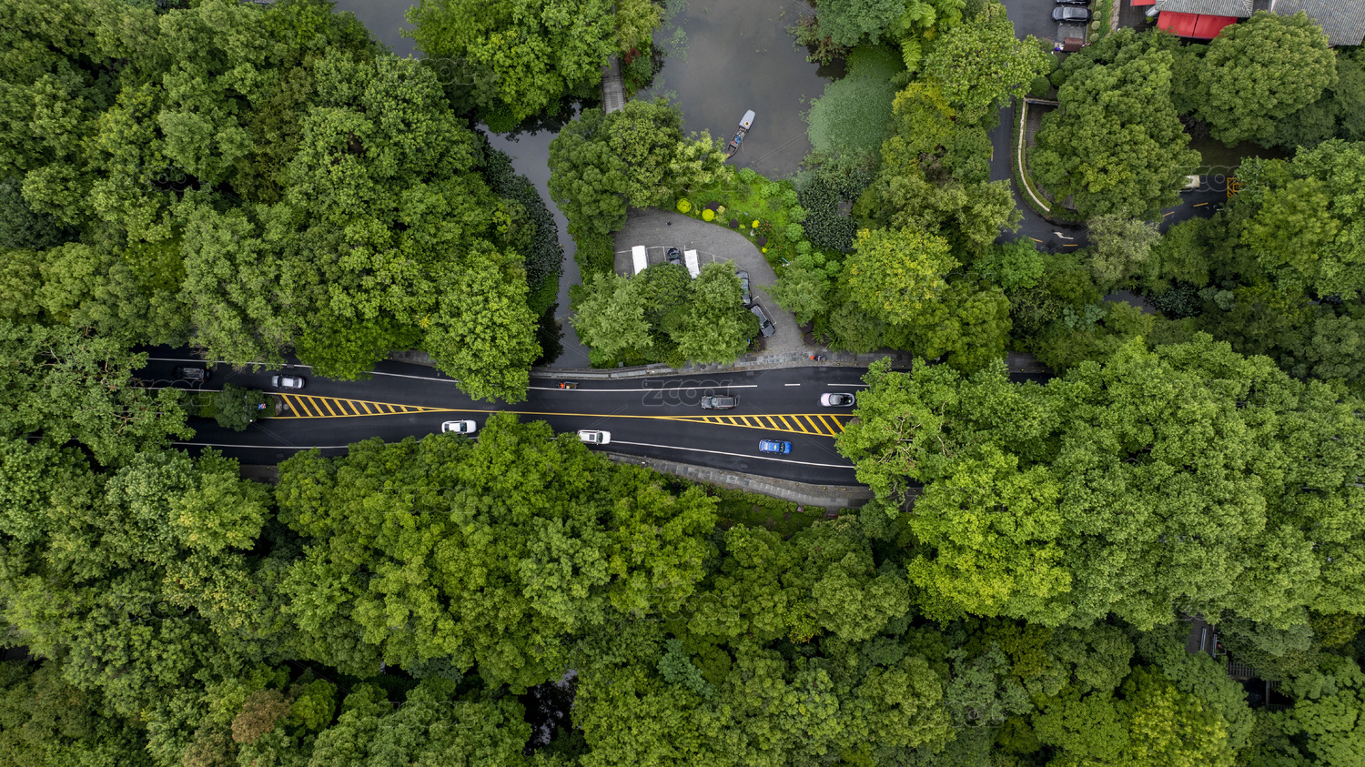 航拍视角下的杭州钱塘江和岸边的道路树林