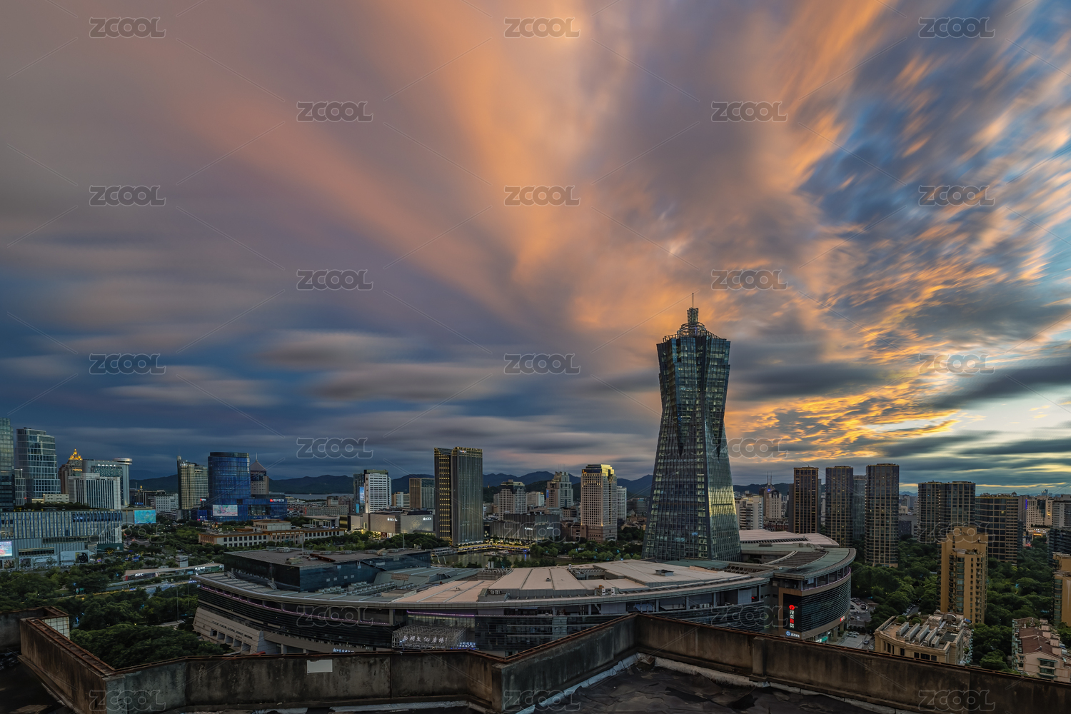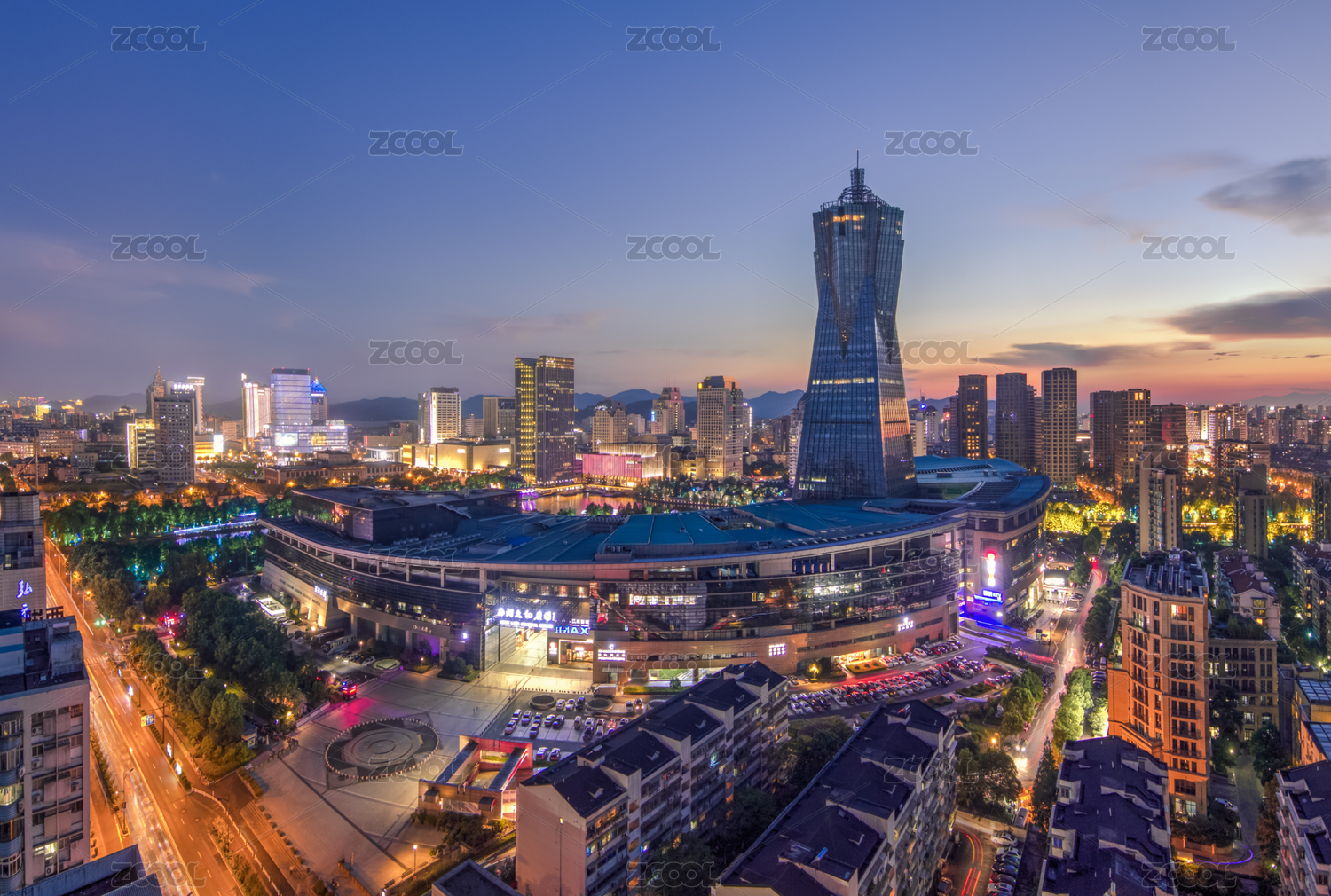 中国浙江杭州城市CBD环球中心建筑高视角风光