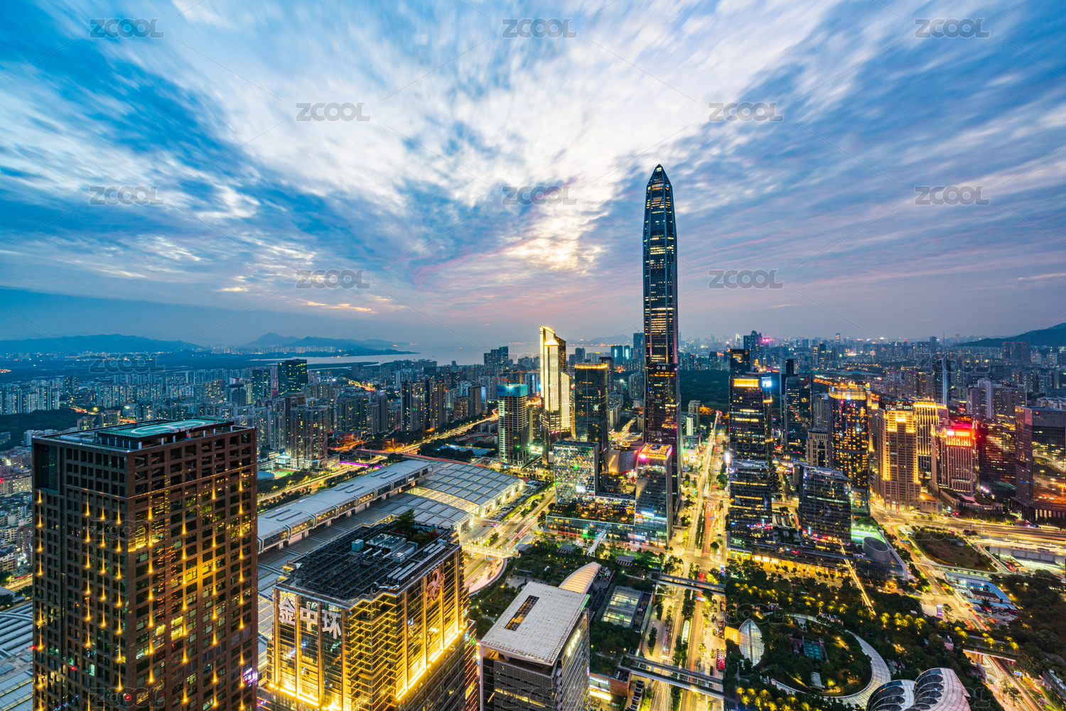 中国深圳市福田会展中心与平安金融中心的入夜灯光