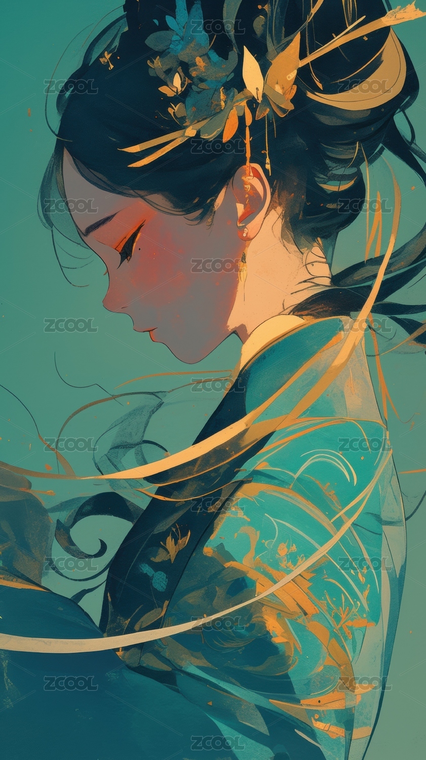 古典美人侧脸华丽服饰与精致发饰