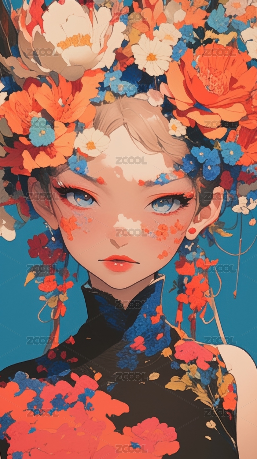 身穿华丽服饰的女子与花卉背景