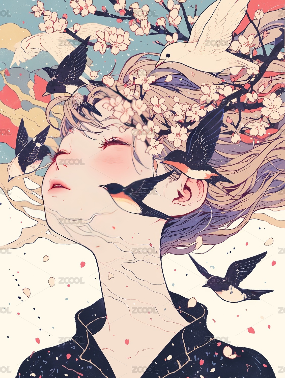 樱花环绕的古典美人