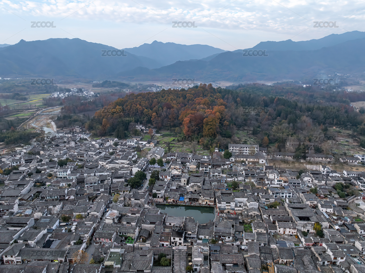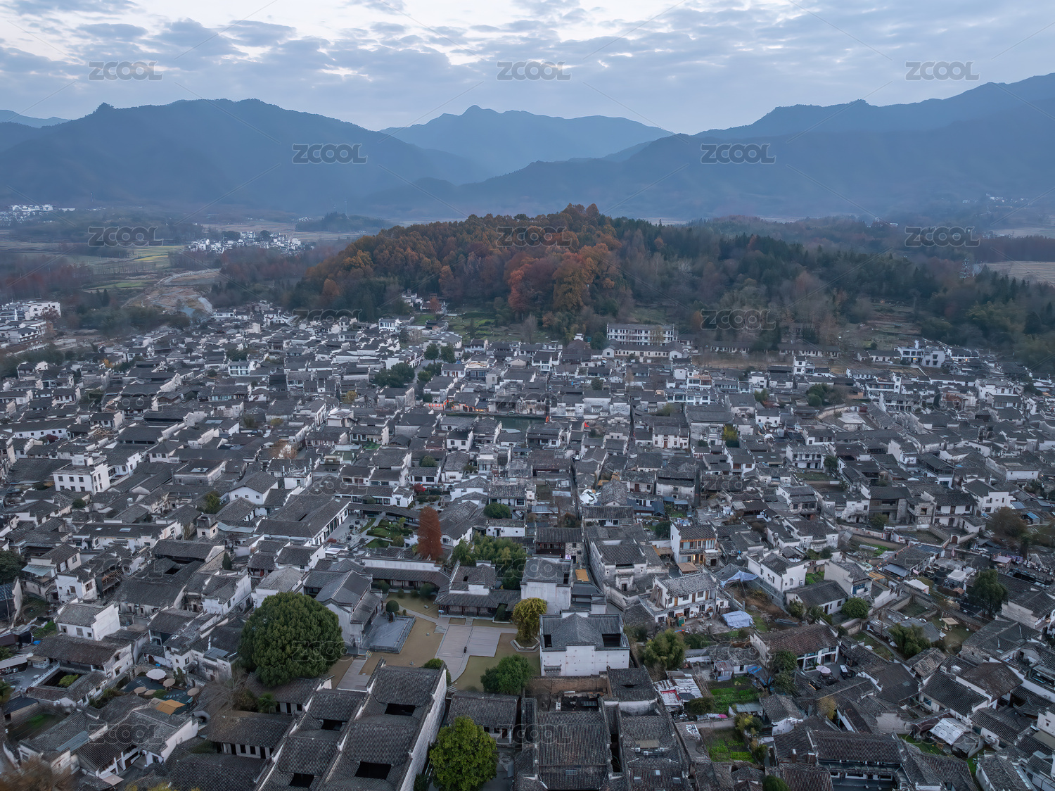 安徽黄山水墨江南宏村徽派建筑群秋色航拍