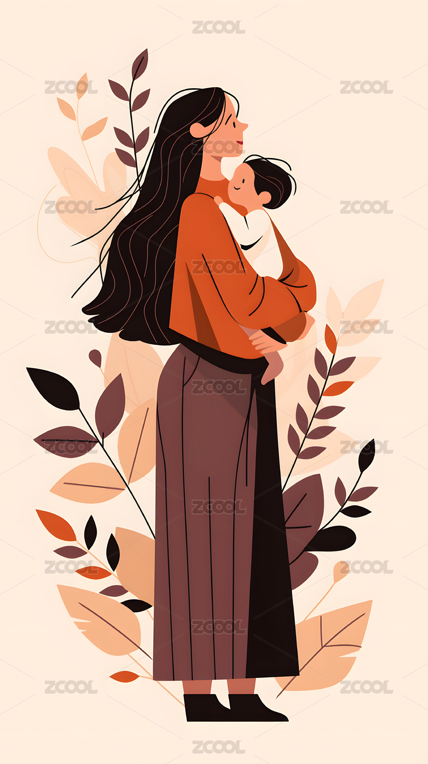 插画风格母子相拥绿植花卉温馨图
