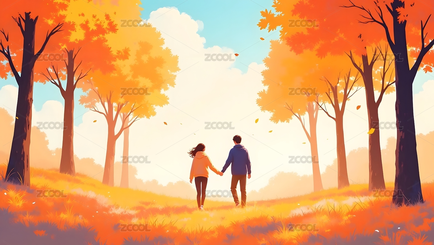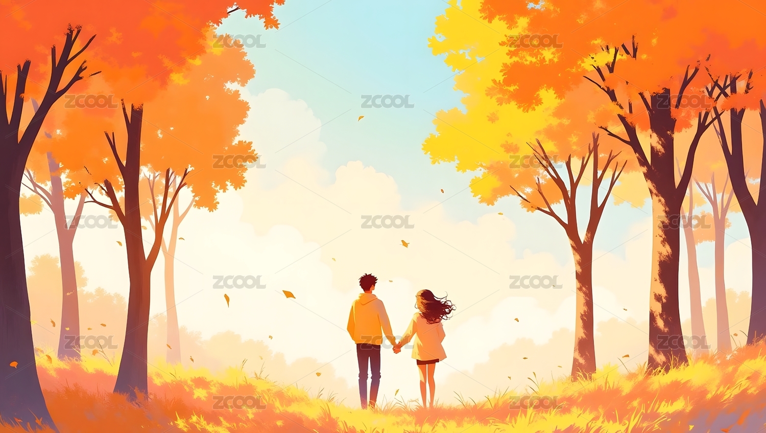 AIGC202402,秋天,森林,树叶,阳光,野餐,氛围,情侣,落叶,枫叶