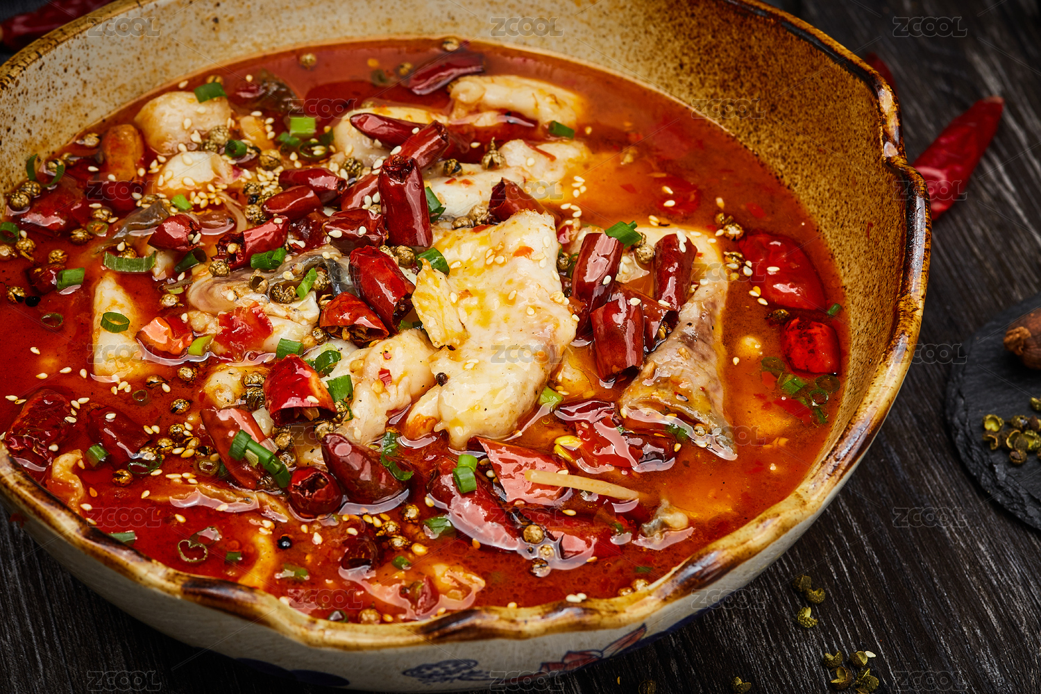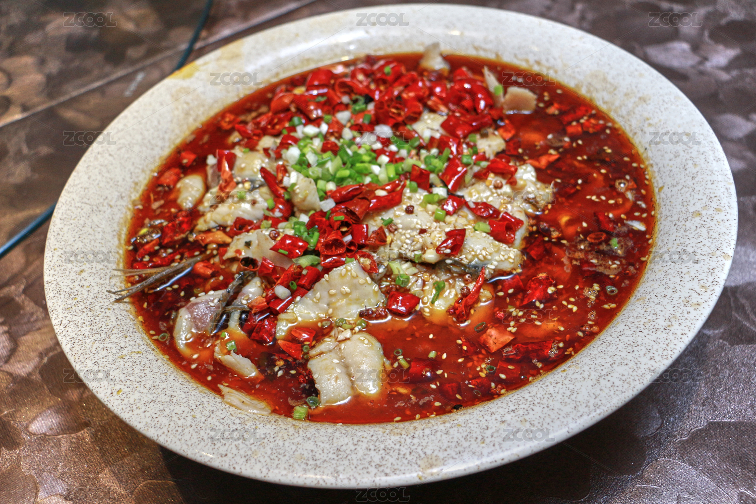 家常菜香辣水煮鱼盛放在灰色花纹的瓷盘里