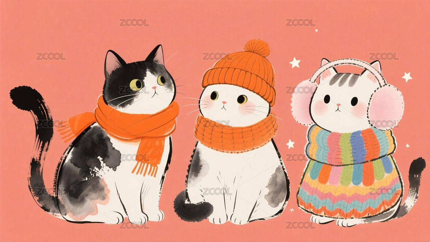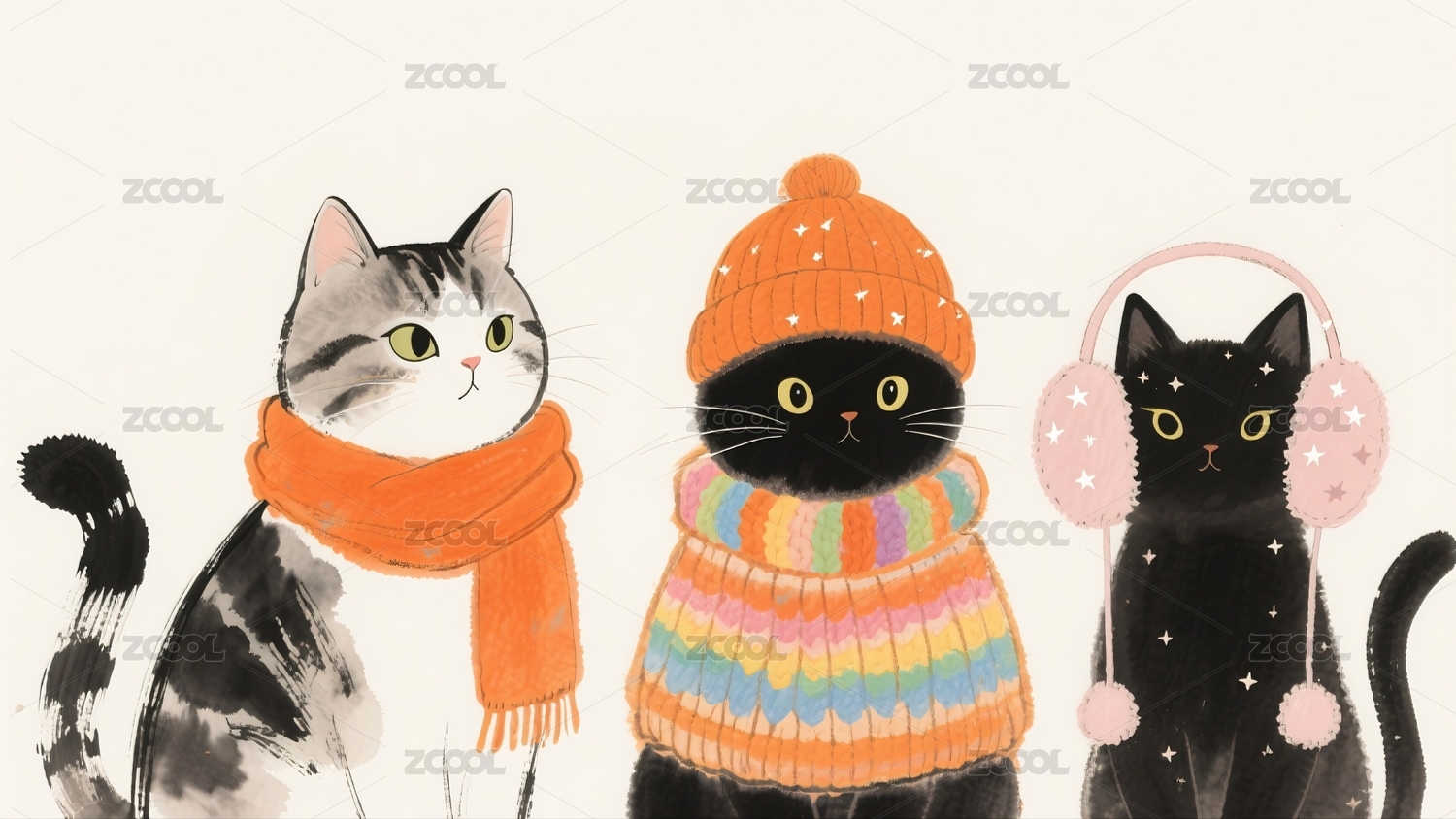 三只猫咪戴着帽子围巾