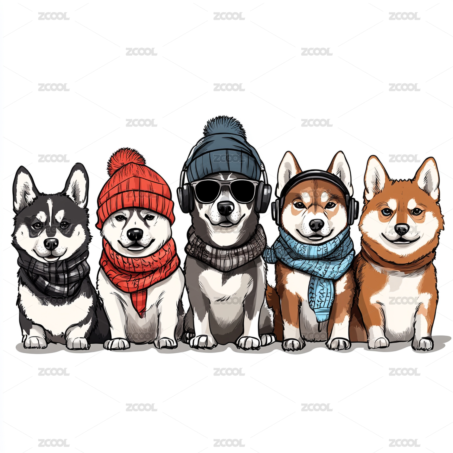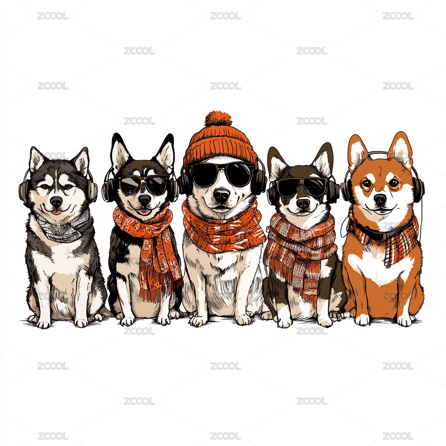 卡通潮流矢量风格小狗围着围巾的印花图案