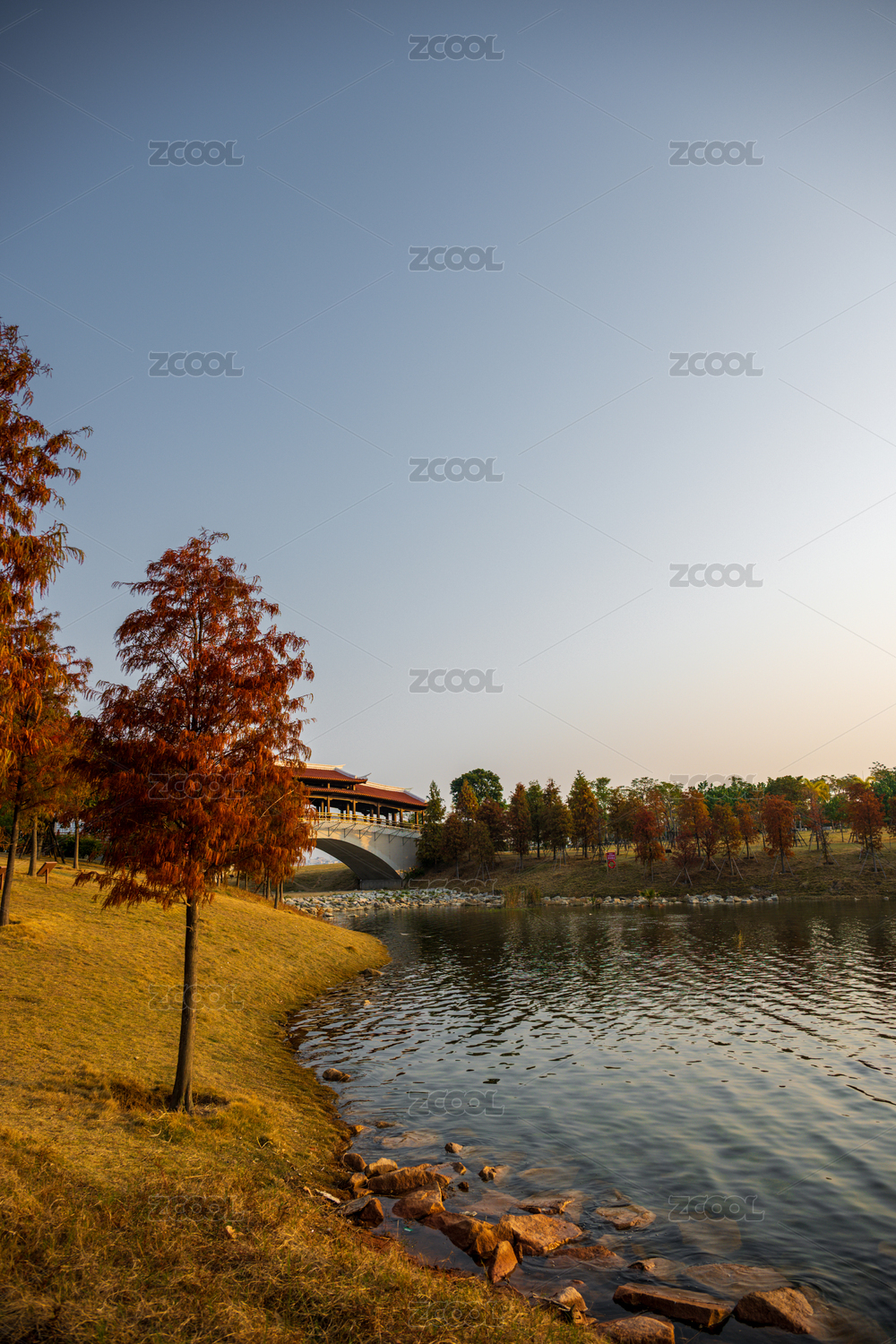 广州麓湖公园夕阳黄昏与落羽杉红叶